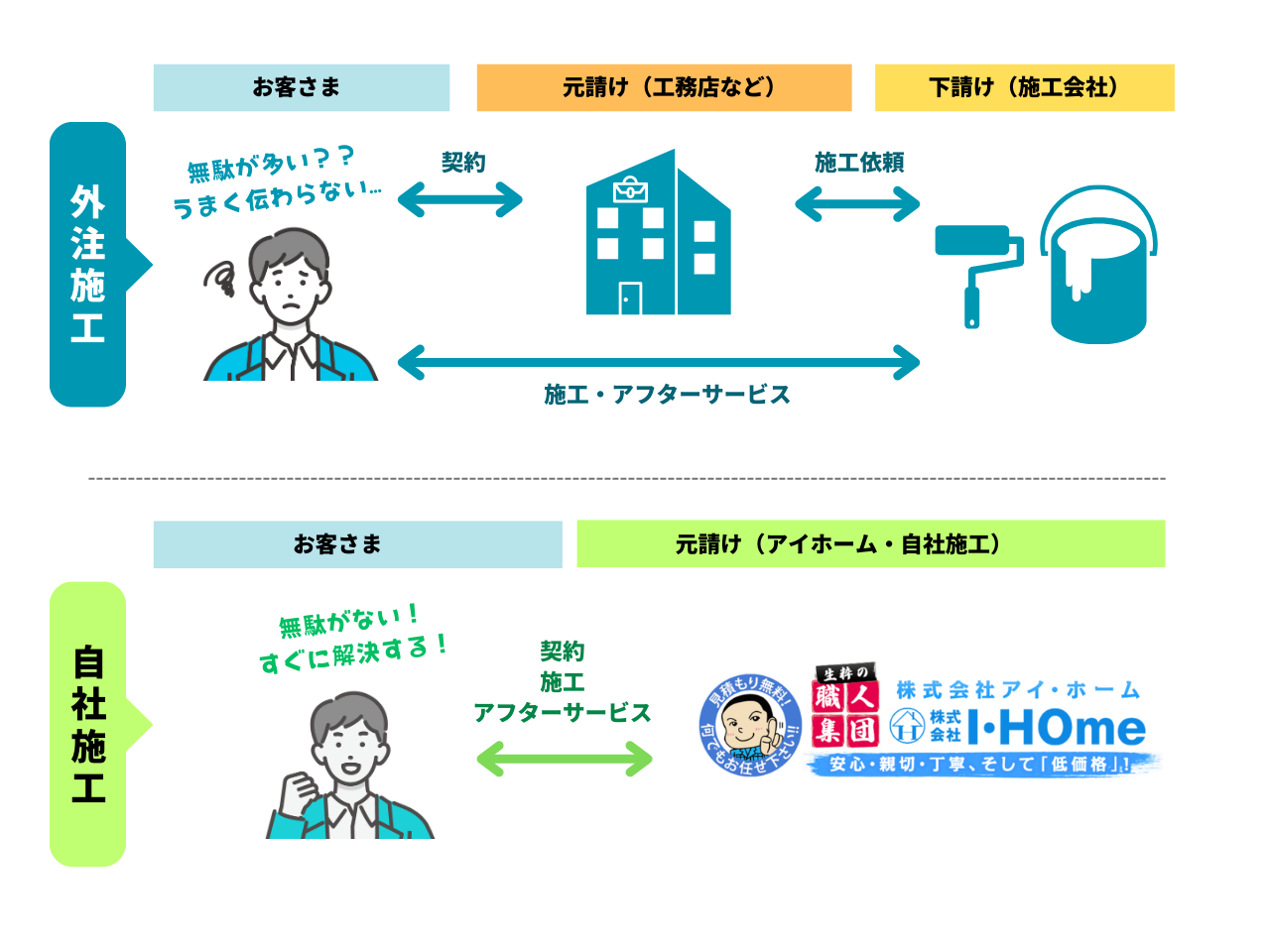 一般的なリフォーム会社や工務店では、受注した工事を自社で施工することはほとんどありません。