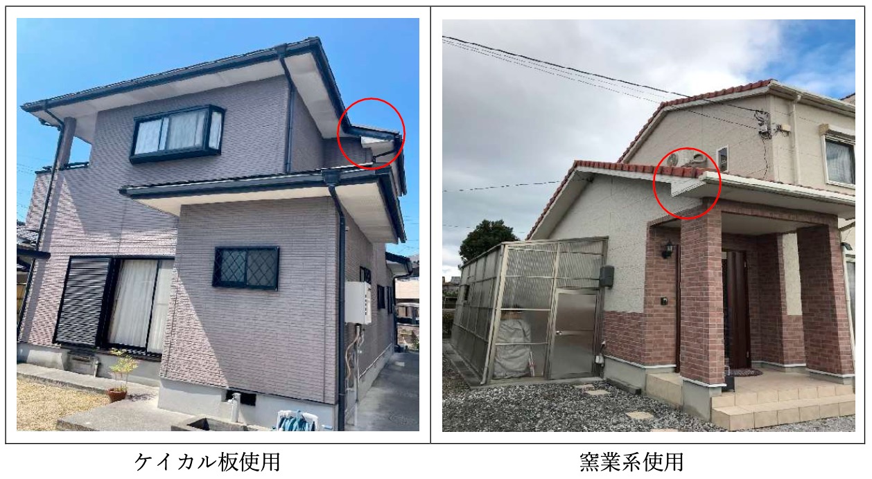 下記の写真のように、赤丸で示した箇所にケイ酸カルシウム板(以下「ケイカル板」)が使用されている場合があります(最近では少なくなっています)。今回は、そのようなケースにおけるメンテナンス方法についてご説明いたします。