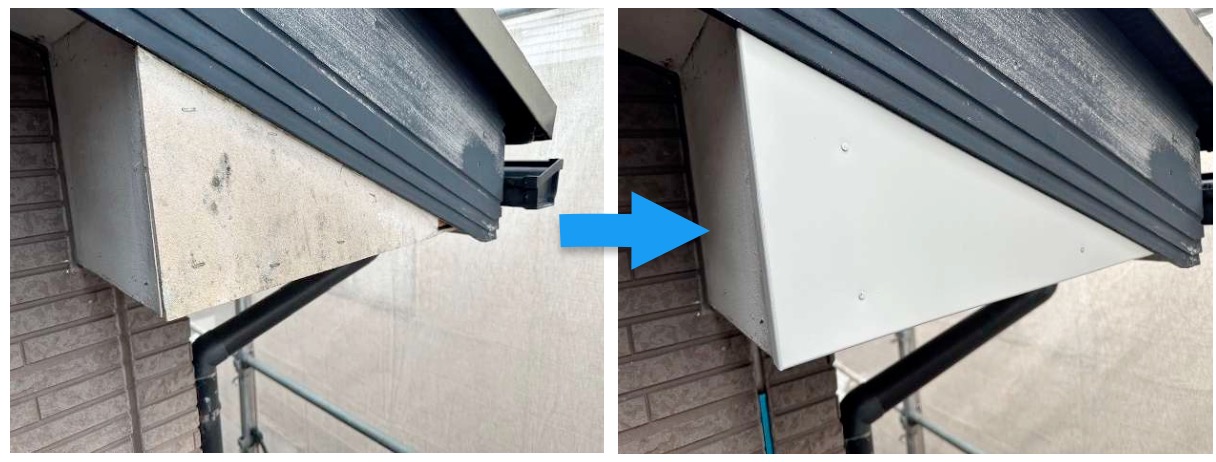 破風板全体がケイカル板で作られている場合は、破風板全体を板金でカバーする施工も行います。