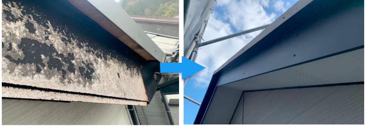 ケイカル板は施工当初は見た目も美しく、塗装によって一時的に美観を保てるものの、風雨にさらされることで劣化しやすい特徴があります。特に破風板に使用されている場合、放置すると内部まで腐食が進行することもあります。