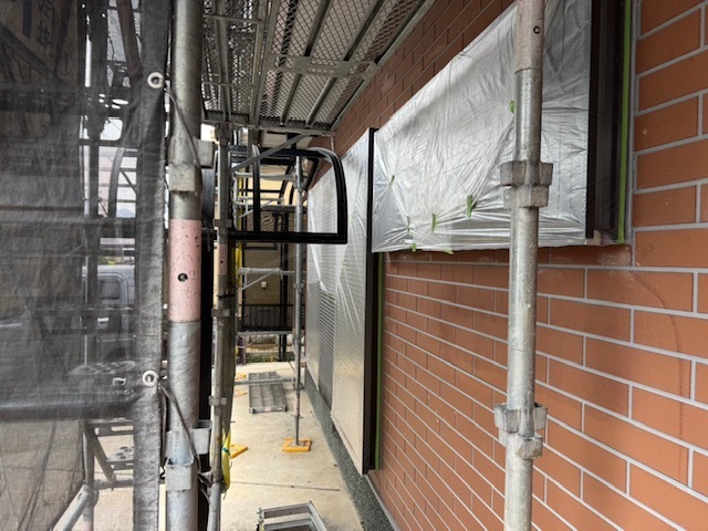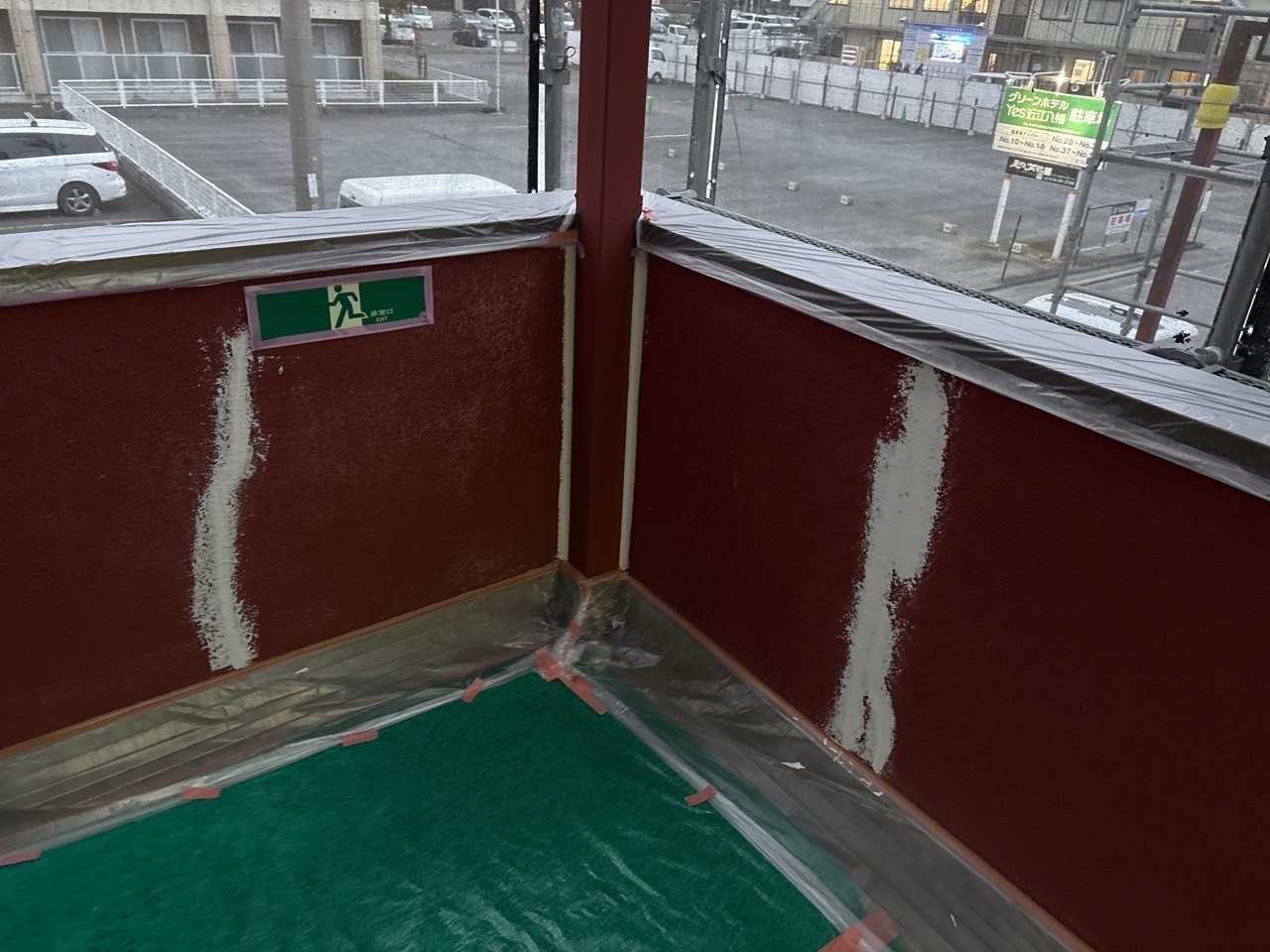 本日の作業は、塗装養生と外壁のクラック部を綺麗に模様吹き戻しをする箇所の下地工事を行いました。明日も引き続き宜しくお願い致します。