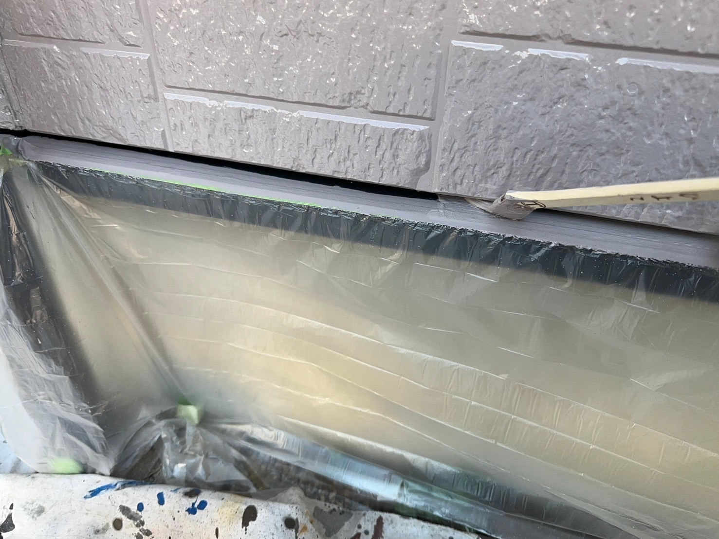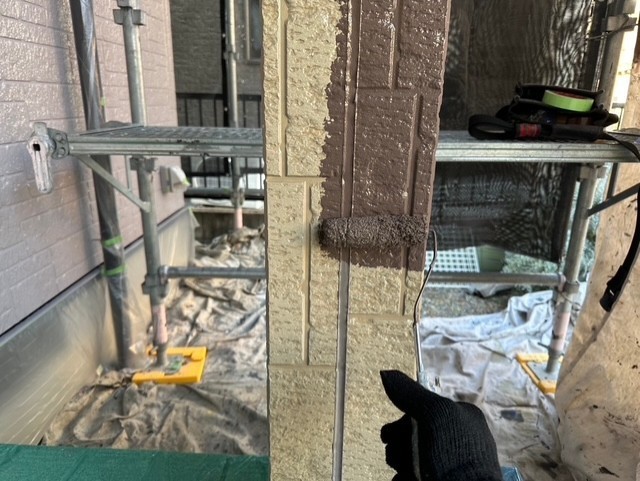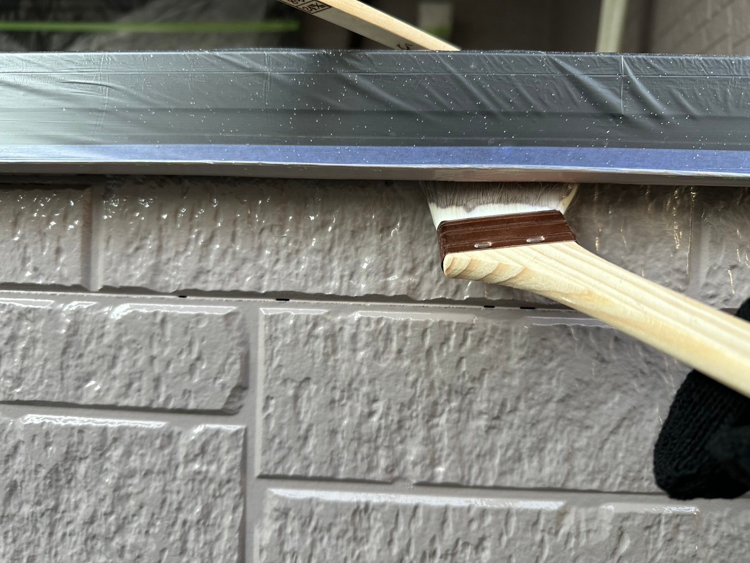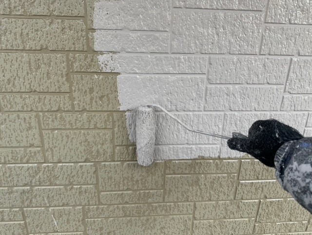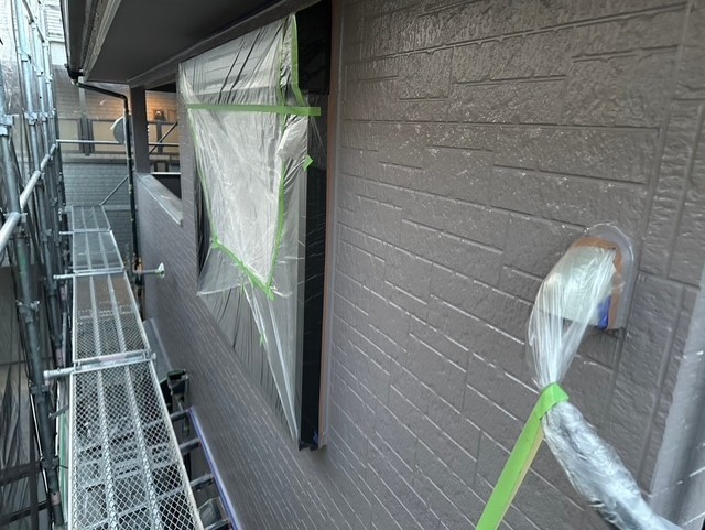 本日の作業内容は、軒天と外壁の取り合いのライン出しと外壁中塗り2回目と玄関ポーチ柱のアクセント部の中塗り2回目まで塗装しました。明日も引き続き宜しくお願い致します。