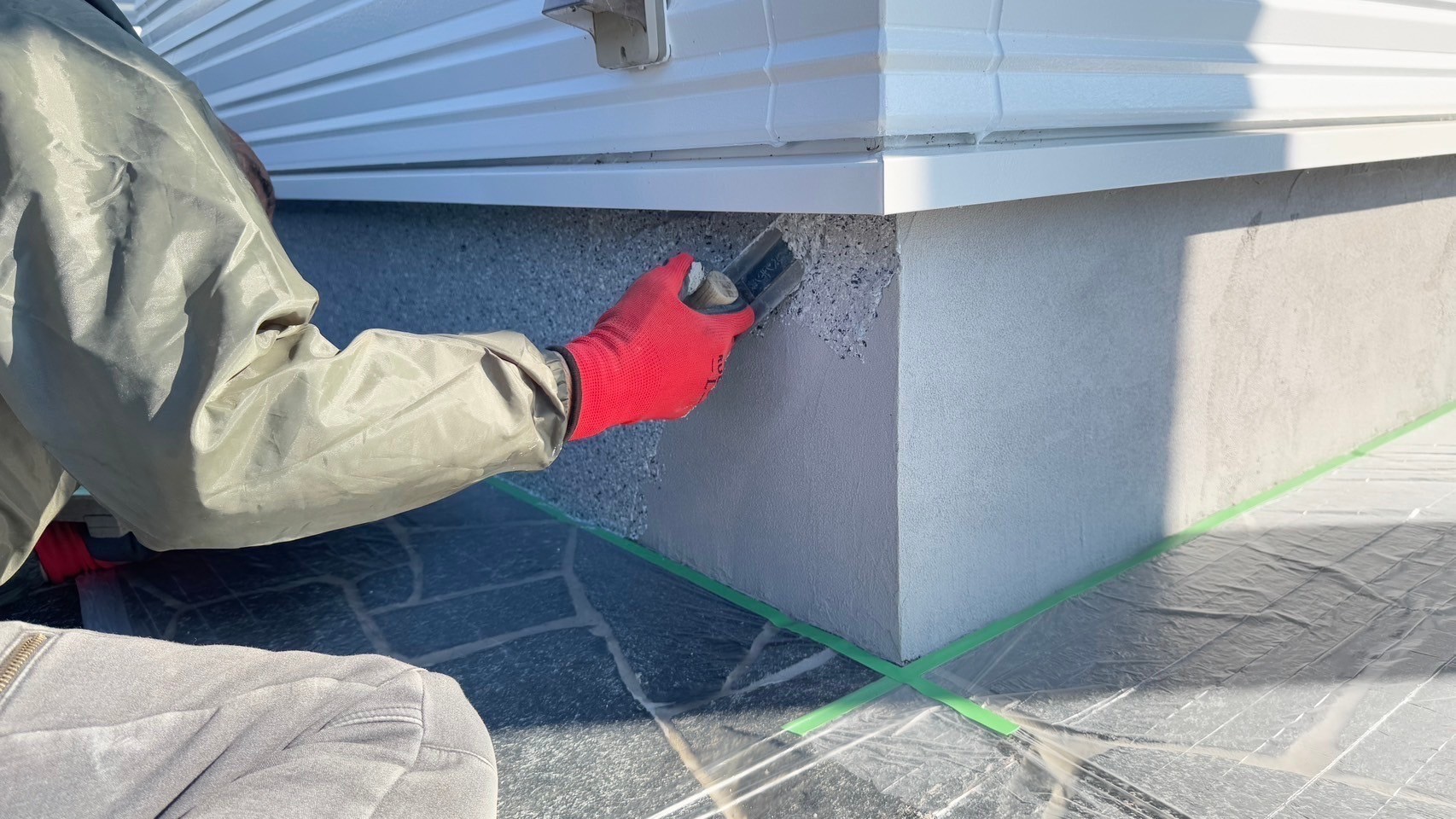 本日の作業は、ALC外壁下塗りを完了して中塗り2回目の途中まで塗りました。明日も引き続き宜しくお願い致します。