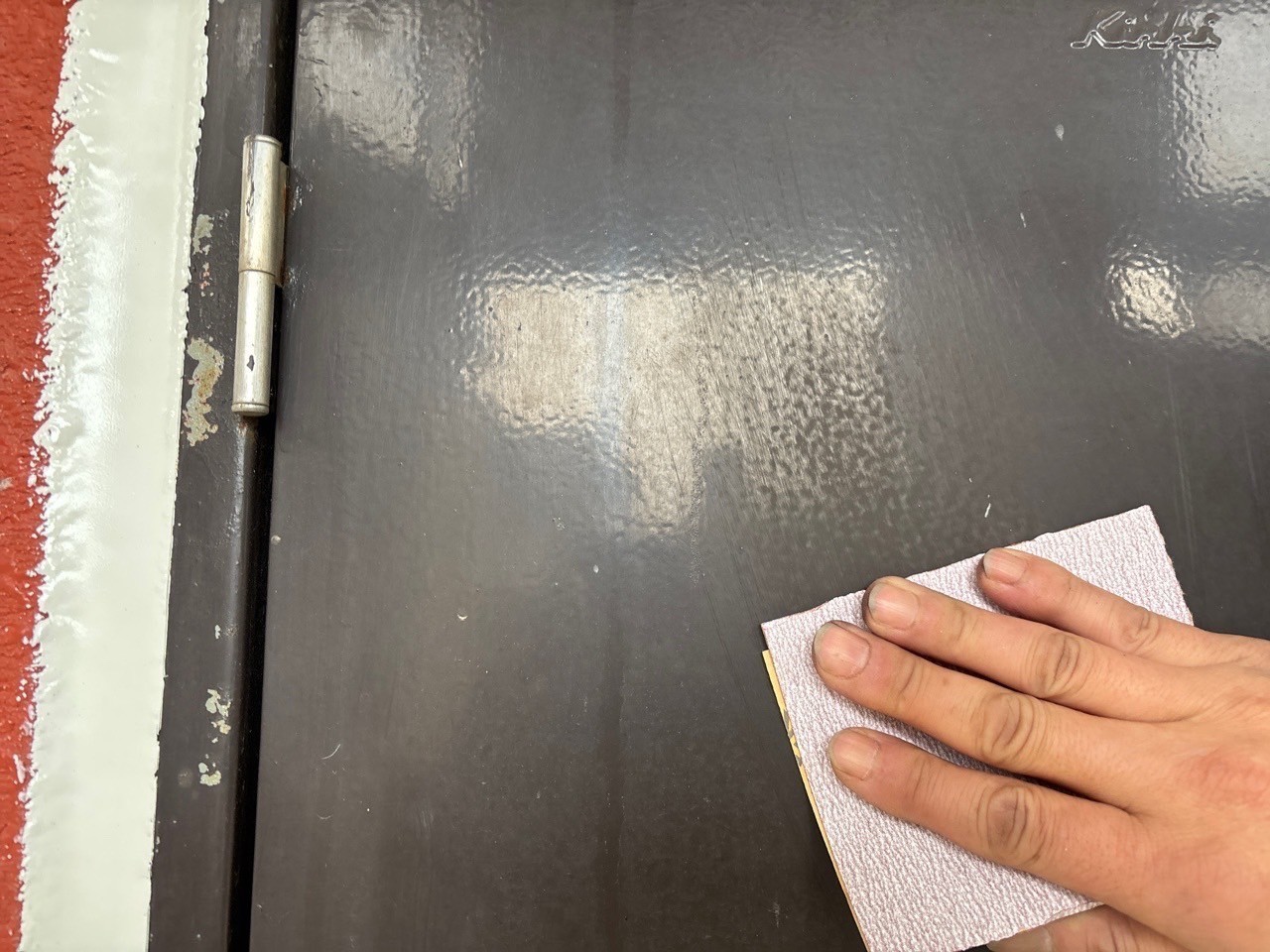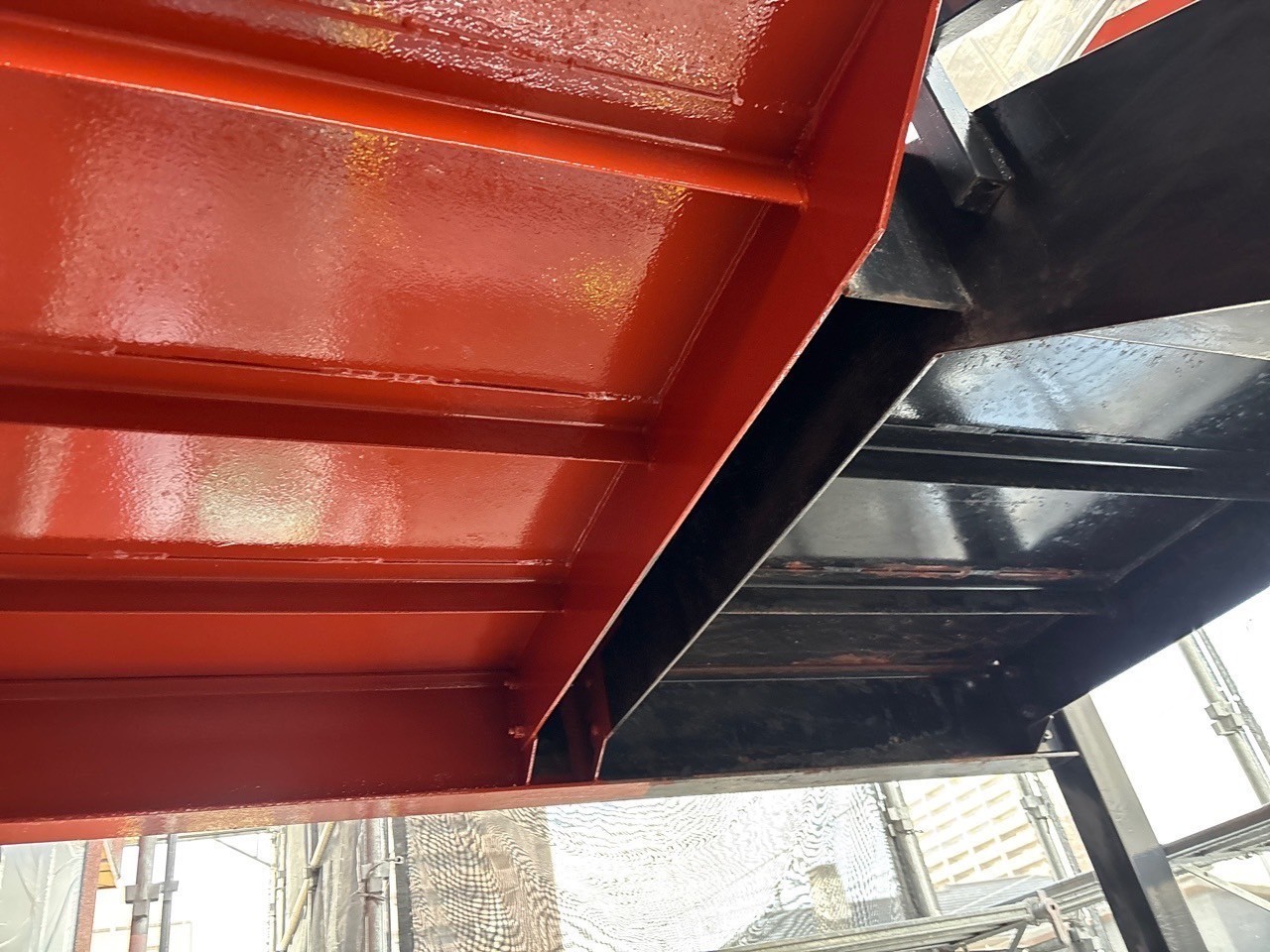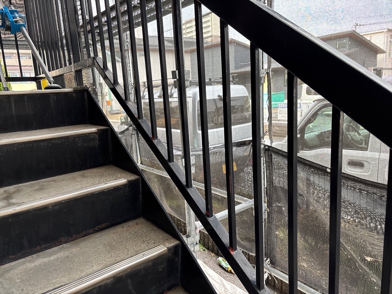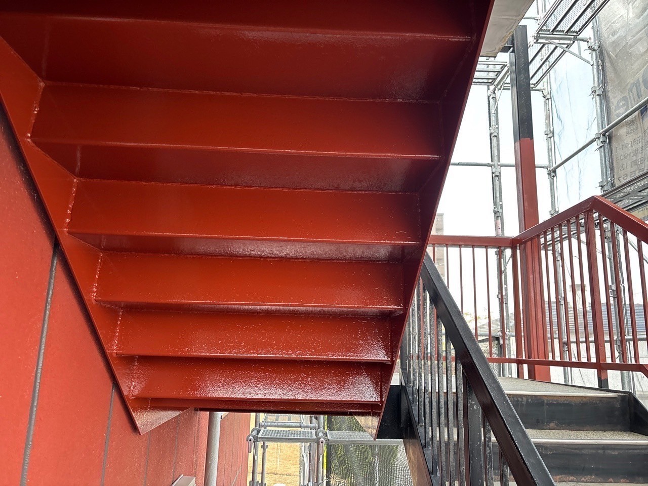 本日は、鉄骨の階段をしっかりケレンして既存の錆を落とし取ってから錆止めを塗りました。後鉄部のドア等のケレンもしました。明日も引き続き宜しくお願い致します。