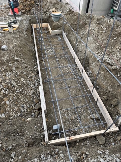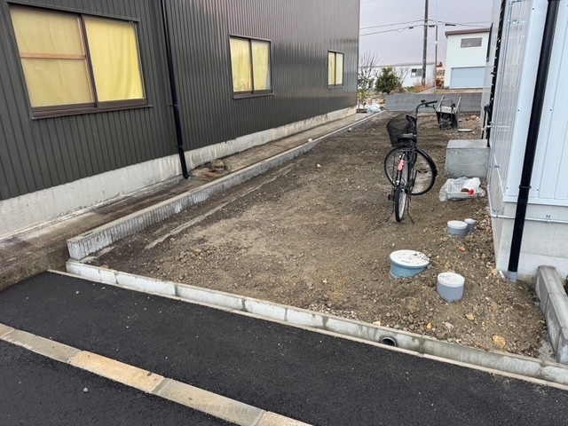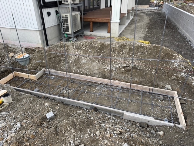 本日の作業はブロック塀、掘削工事に鉄筋組みした後に捨てコンクリートを入れベース打設工事を致しました。引き続き明日もよろしくお願いいたします。