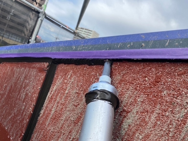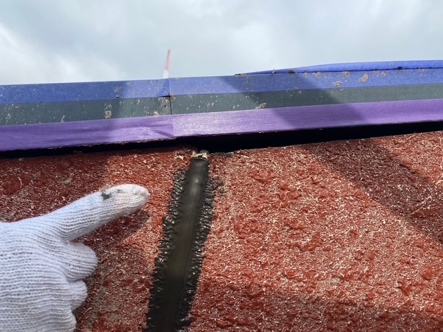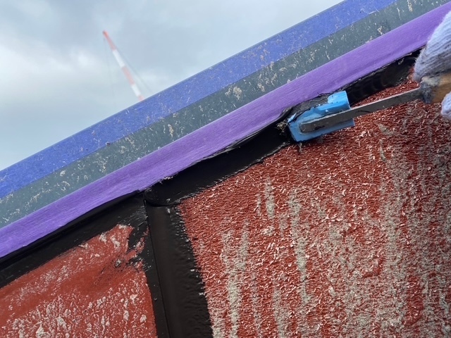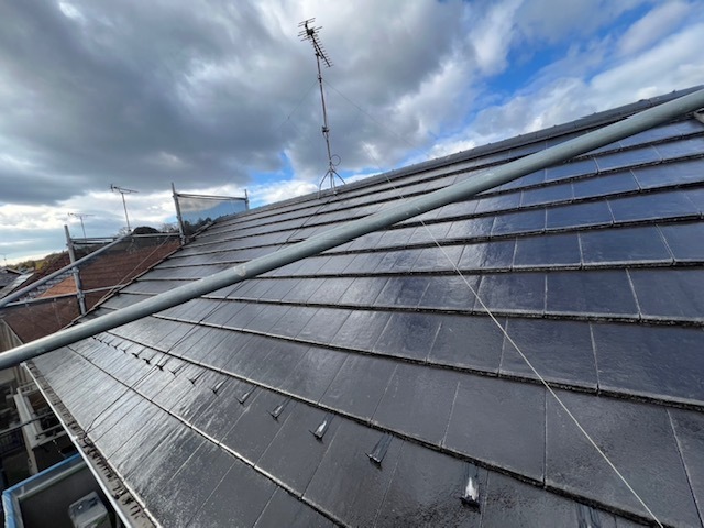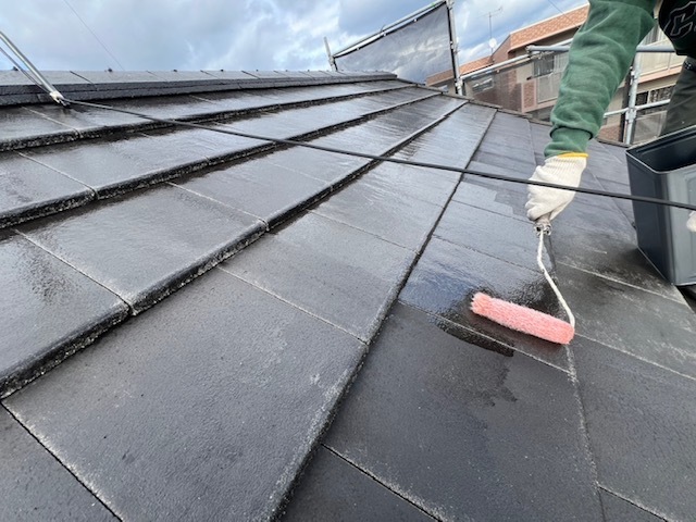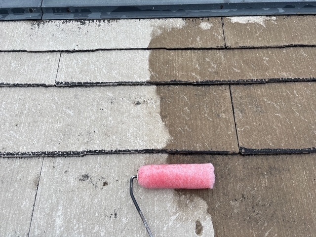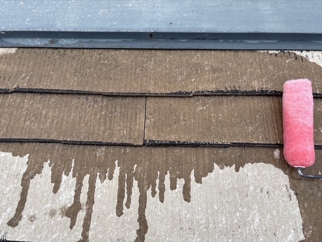 塗装作業はスレート屋根(コロニアル)のパーフェクトシーラーで下塗り作業一回目塗りをしました。