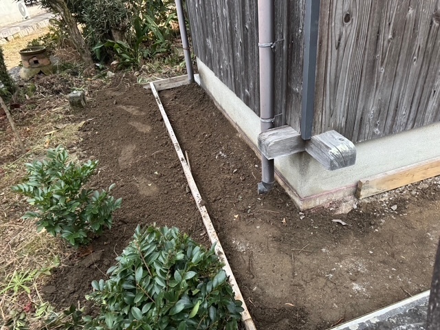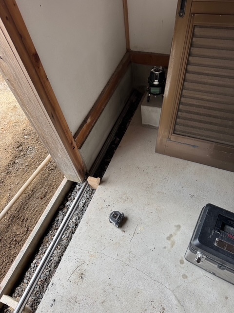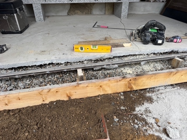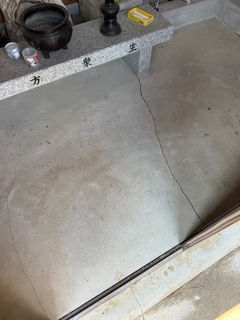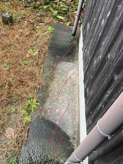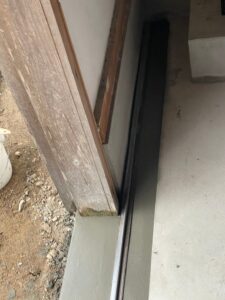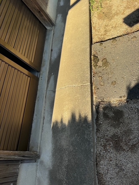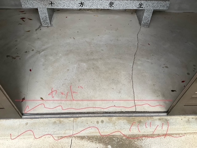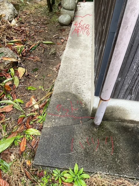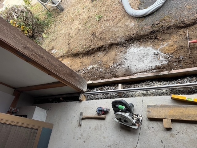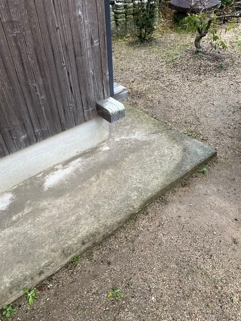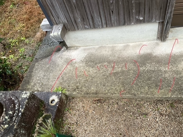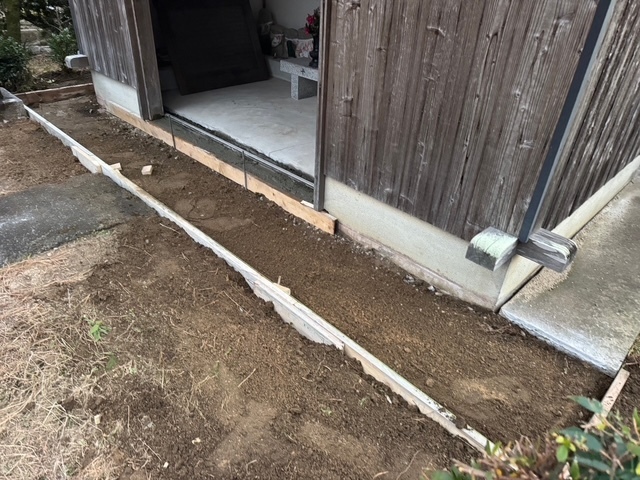 昔の犬走り工事のやり方なのでメッシュが入ってないからコンクリートが割れ盛り上がり引き戸が閉まらなくなってますので本堂に続き依頼を受けましたので今日は破損部の犬走りを削り、解体工事をして型枠工事まで致しました。明日は雨なので明後日にコンクリートの打設工事をする予定でおります。年内には何とか終わらせます。引き続き宜しくお願い致します。