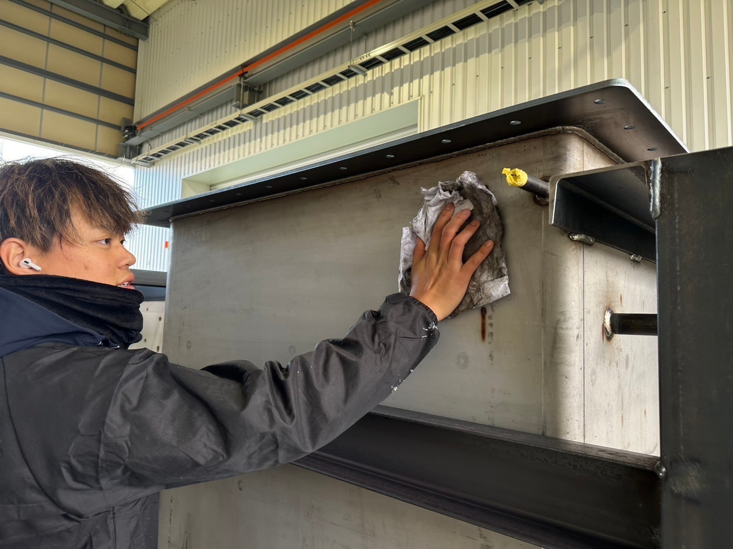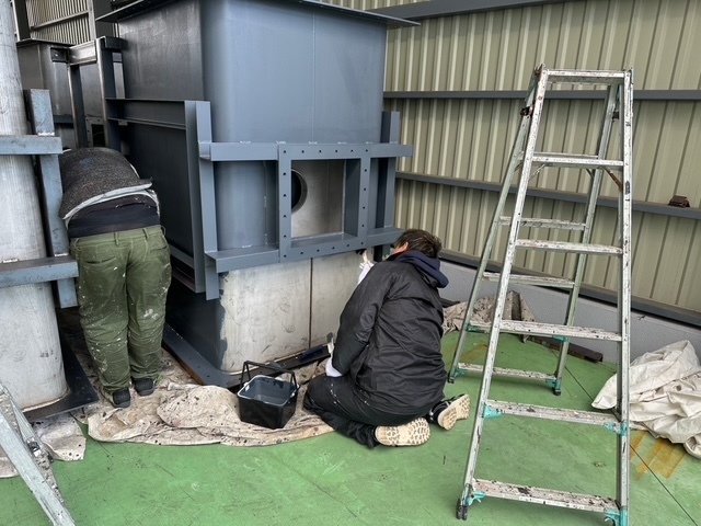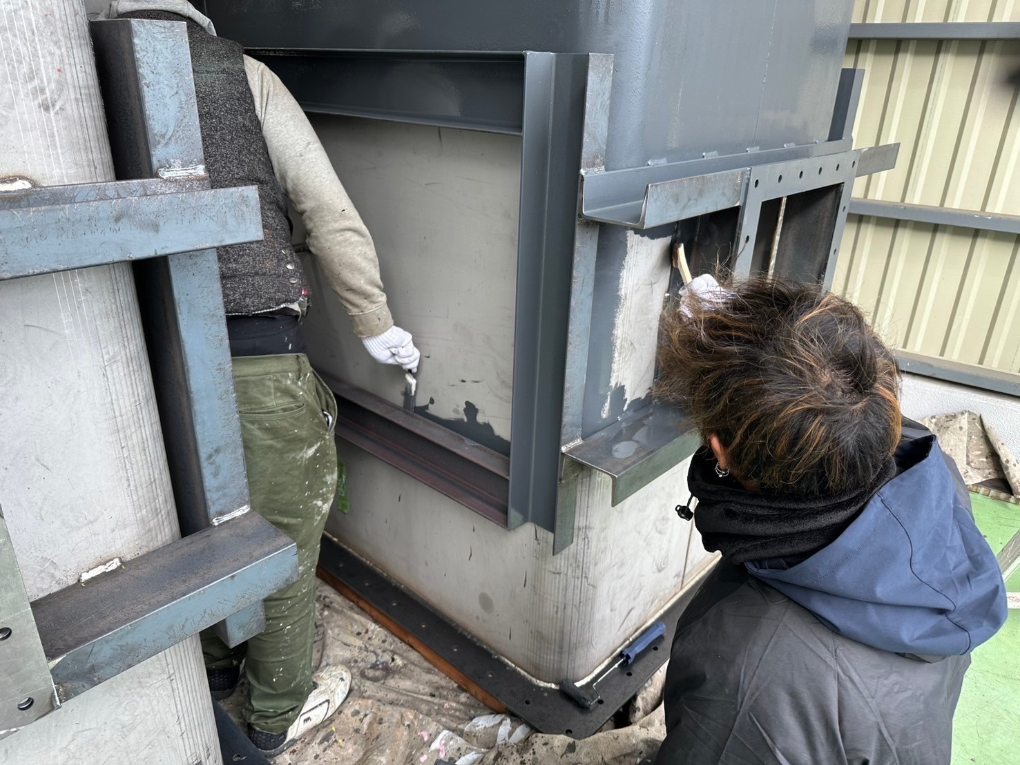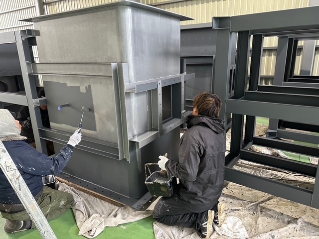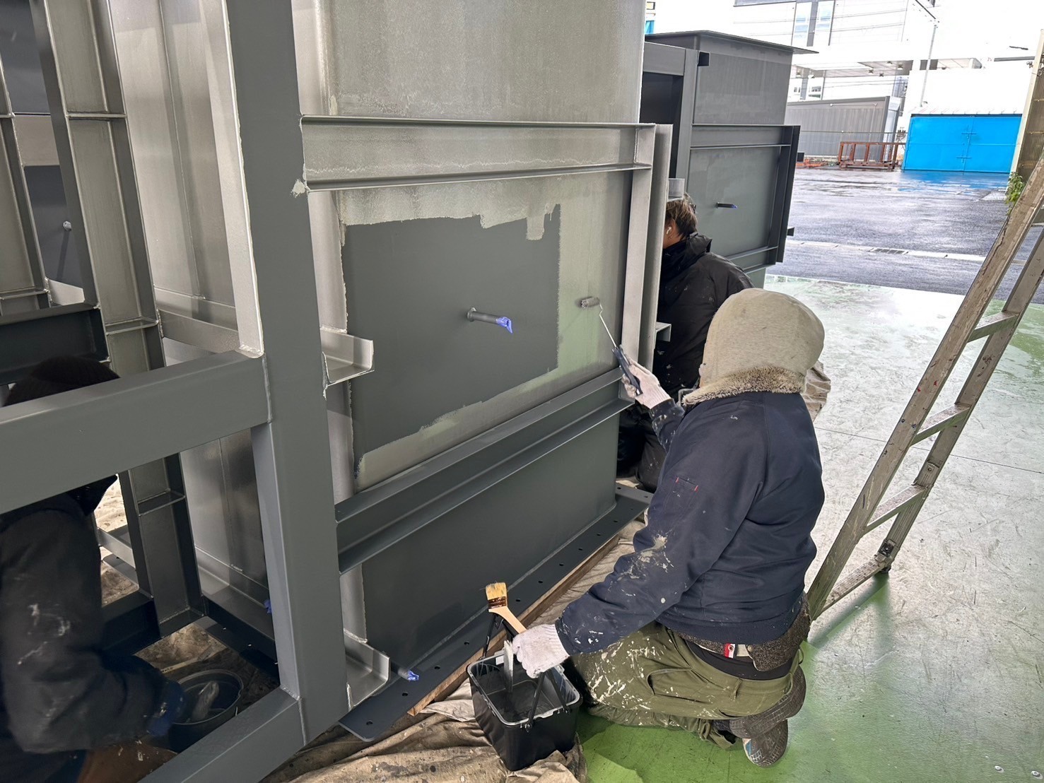 本日から追加の冷却庫の鉄油拭き取り後、錆止め塗装し耐熱塗料のシルバーも少し塗りました。工務と応援2人で朝早くから頑張って頂き昼から専務にも応援に来てもらい何とか明日5台キッチリと仕上げます。有言実行のアイホームに何でもお任せくださいね。明日も引き続き宜しくお願いします。