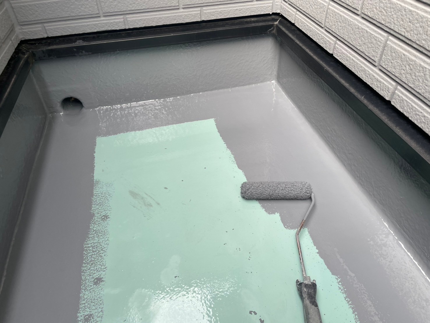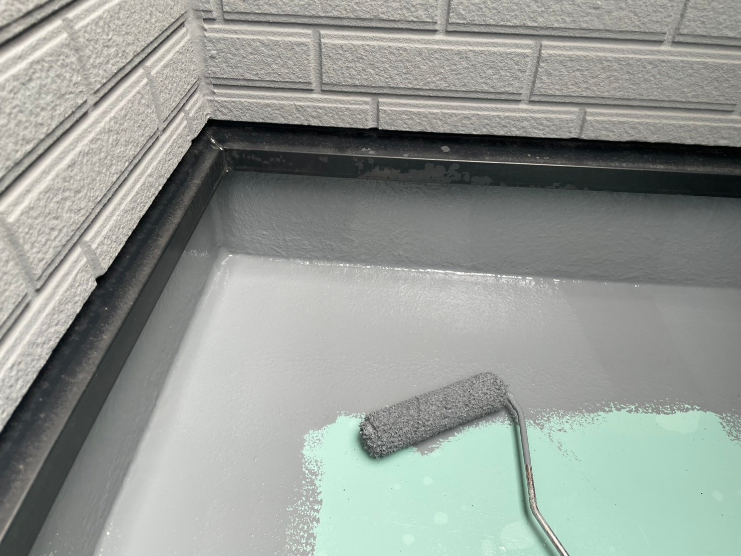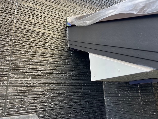 防水工事完了しました。ベランダが夜露と昨日の雨で濡れていたので乾いてから作業開始しました。ベランダ下端もコーキングで処理しました。後日軒天塗装して完了です。引き続き宜しくお願いします。またアップします。