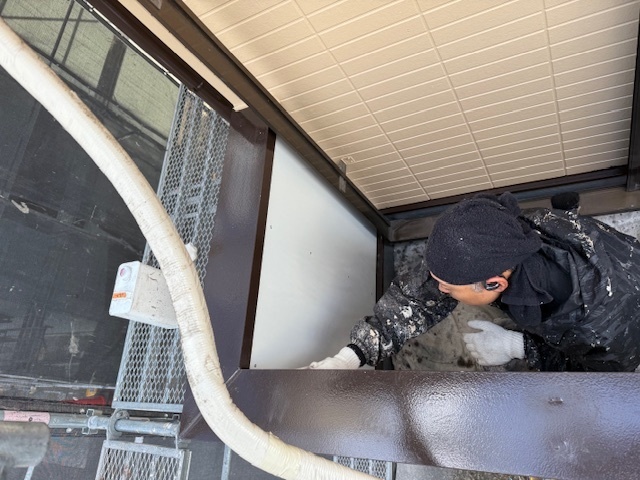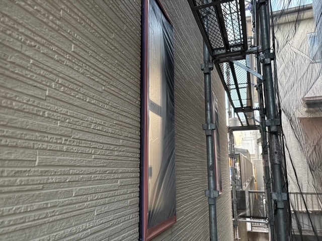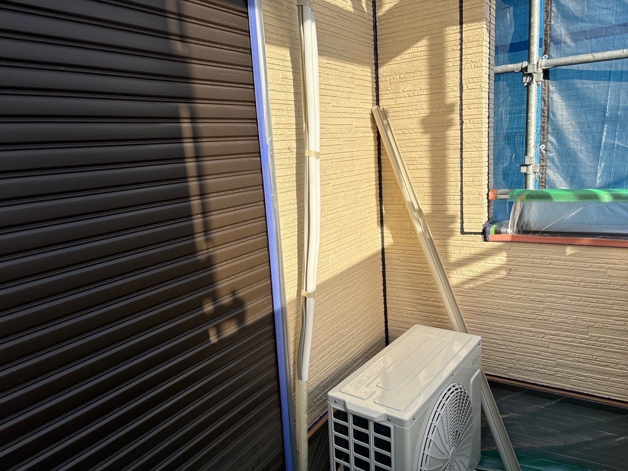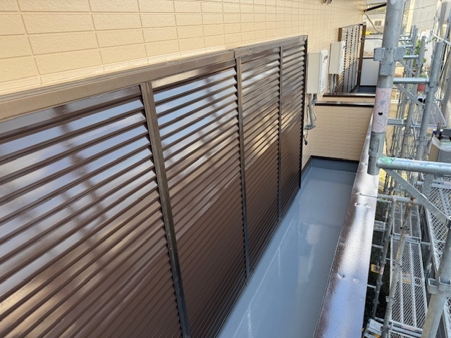 防水工事が終わったベランダ内部の壁面仕上げです。明日には室外機や荷物を戻す予定です。いよいよ来週には足場解体です。2棟同時に解体進めて行きます。またアップします。