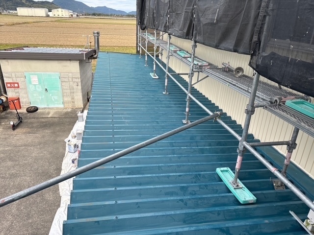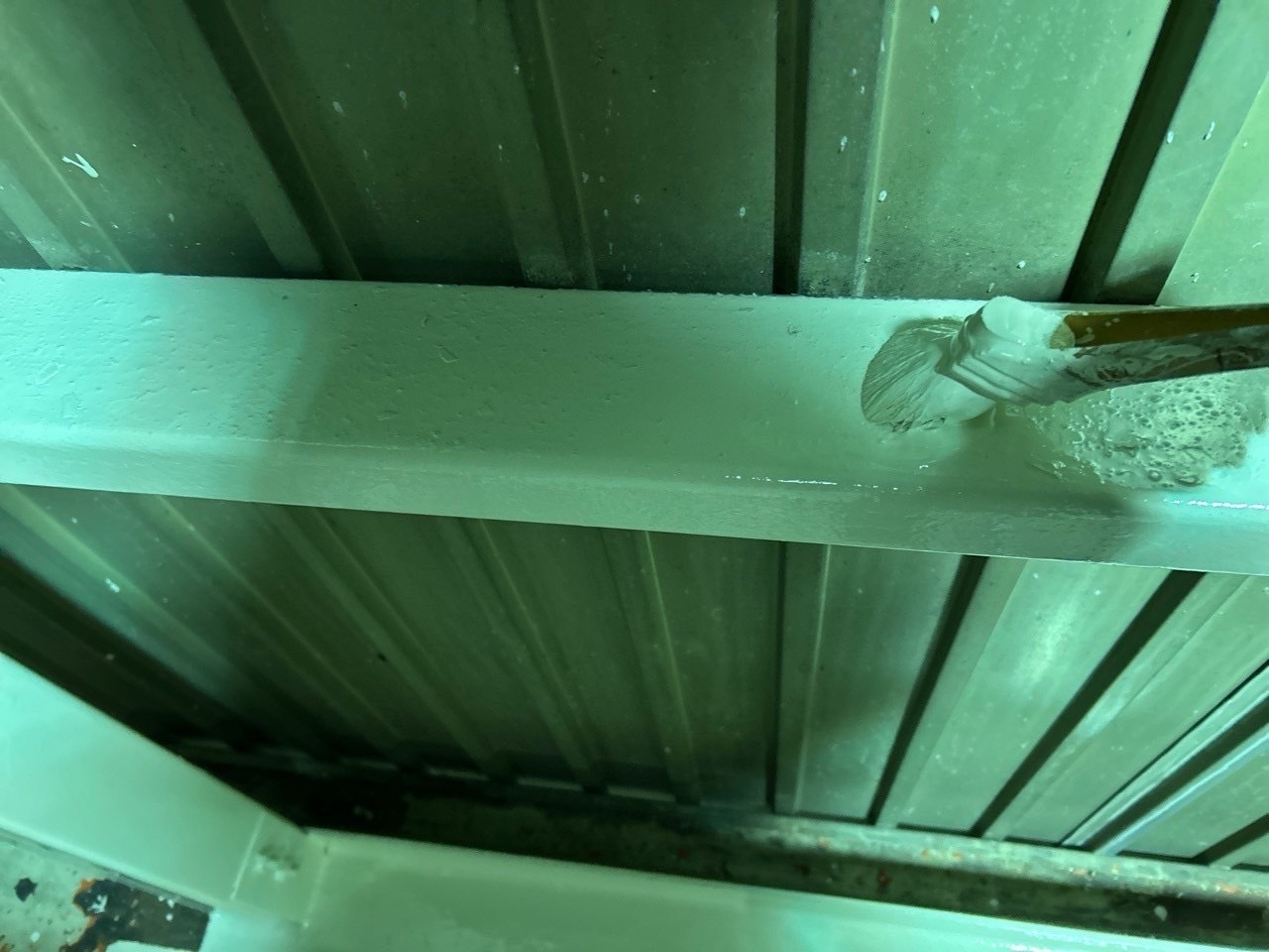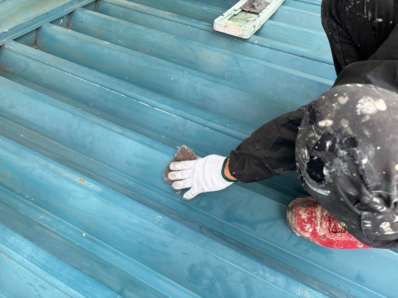 本日の作業は折板屋根のケレン、錆止め塗装とパラペットの上塗り作業を致しました。引き続き宜しくお願いします。またアップします。