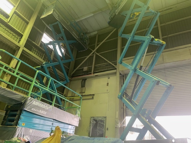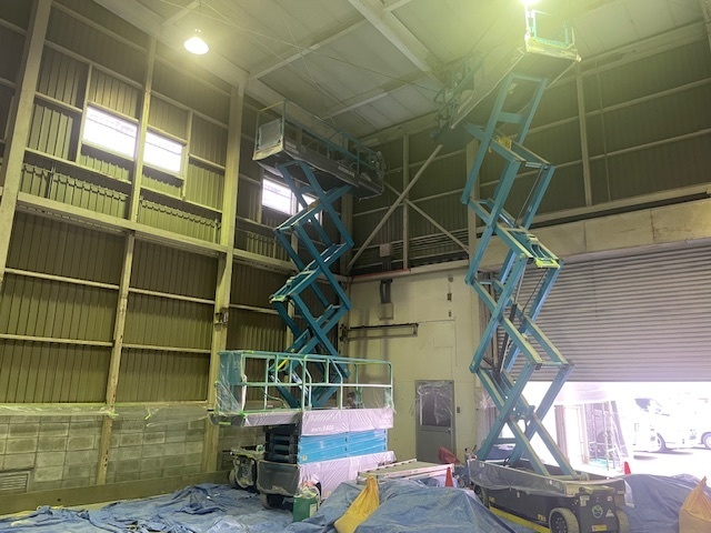 今日は高所作業車3台で倉庫内部の鉄骨の錆止め作業を進めました。ケレン作業が思いのほか大変で時間掛かりましたが塗装工程に入っていきます。引き続き宜しくお願いします。またアップします。