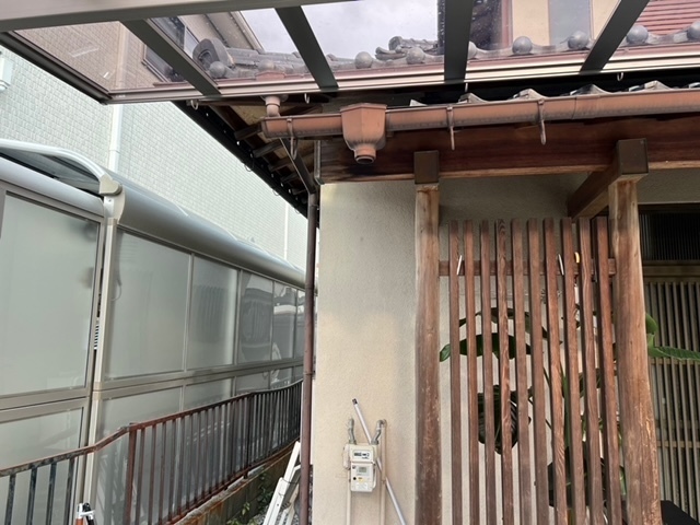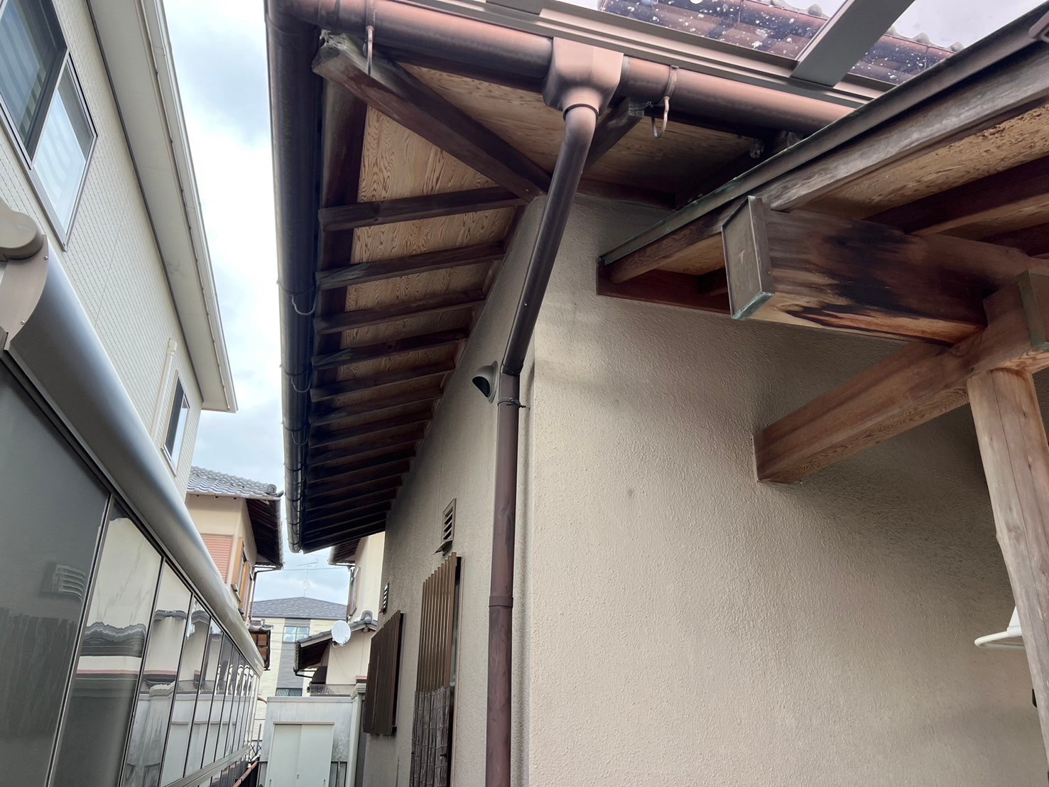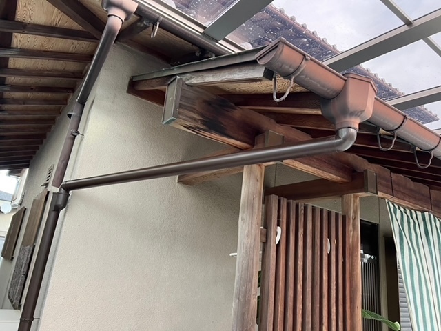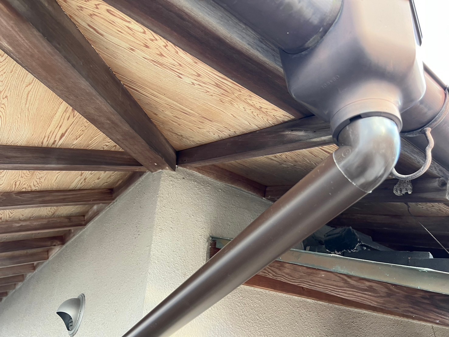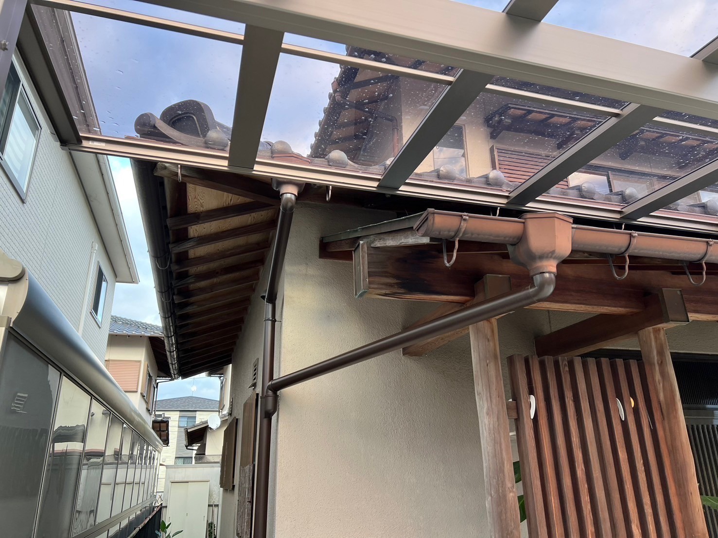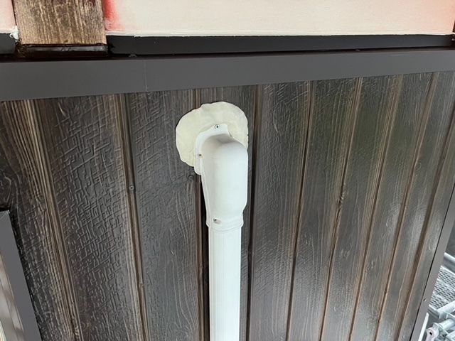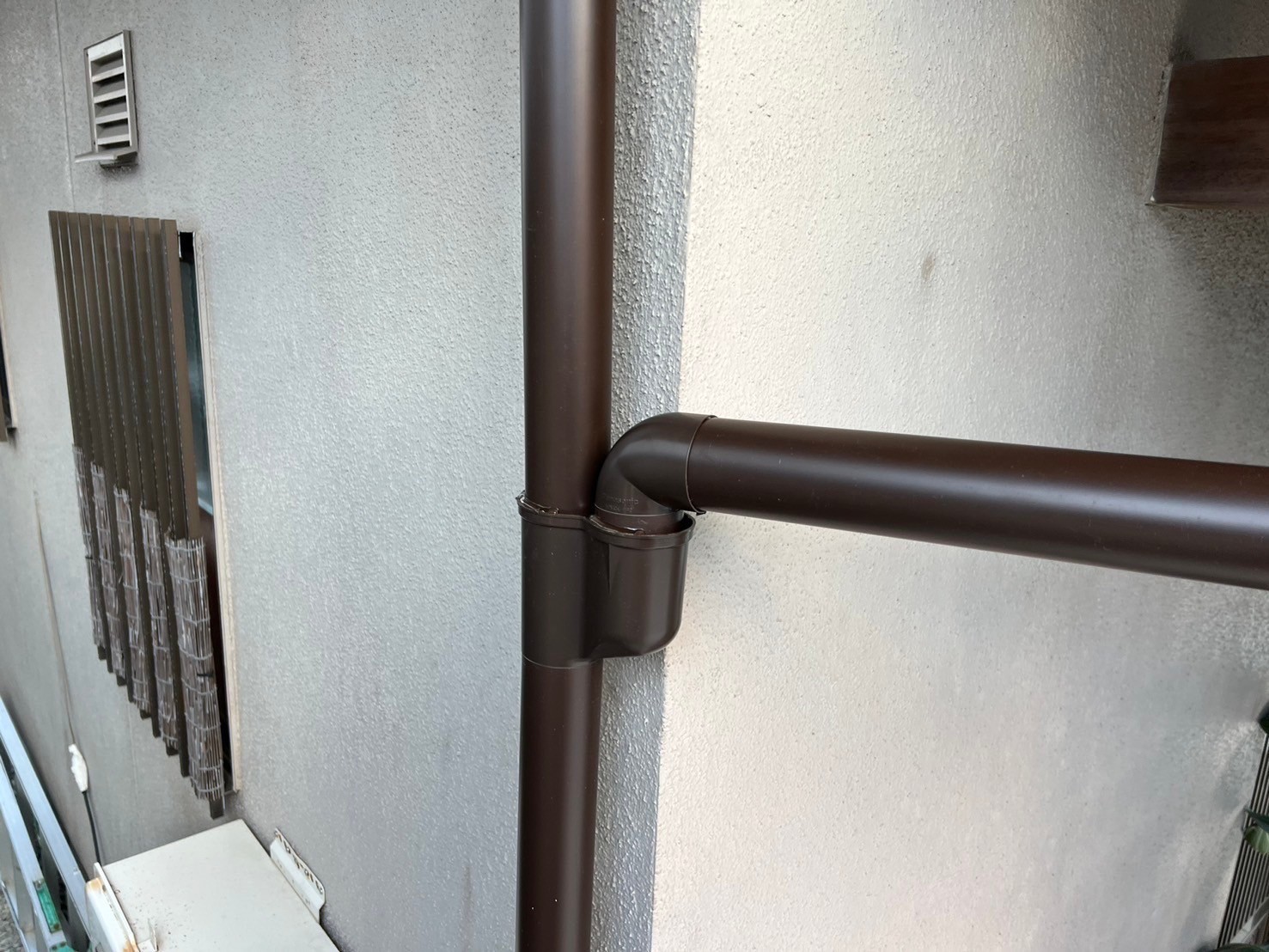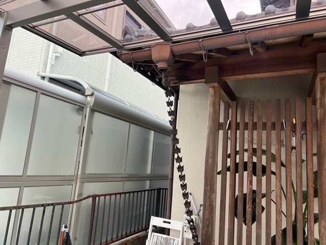 玄関の竪樋の交換工事をさせていただきました。鎖樋から60Φの竪樋に交換し二又部品で落し口もスッキリしました。Hさま大変お世話になり、ありがとうございました。