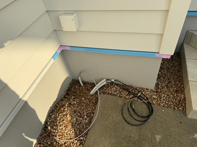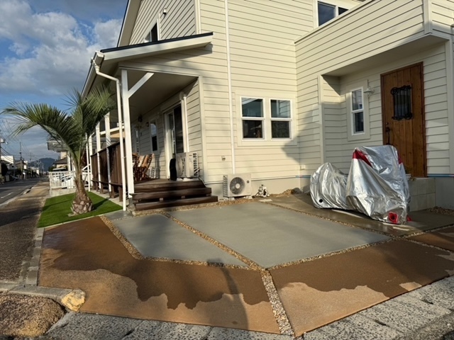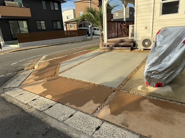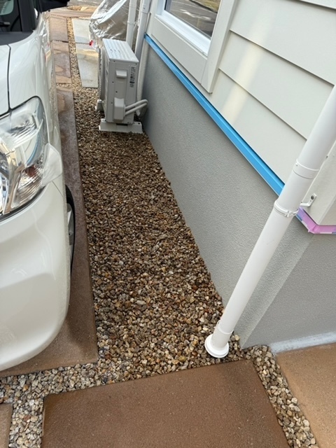 本日の作業は、土間の型枠の解体と短粒石の戻しに電飾の設置を致しました。外構の残り作業は電気工事の結線工事のみです。引き続き宜しくお願いします。