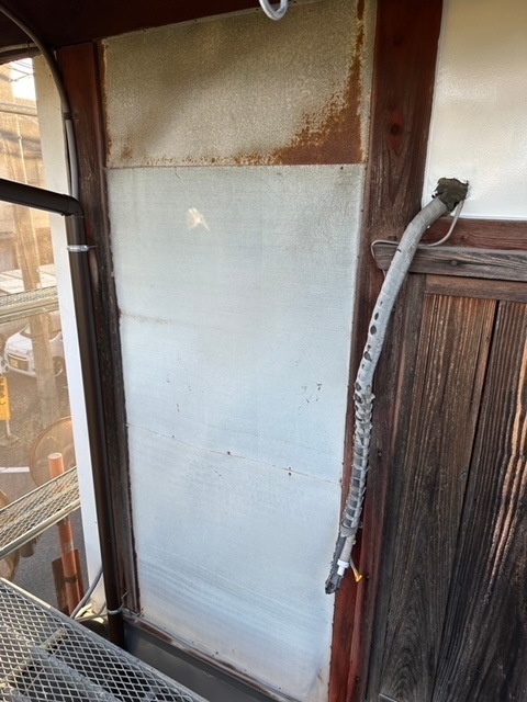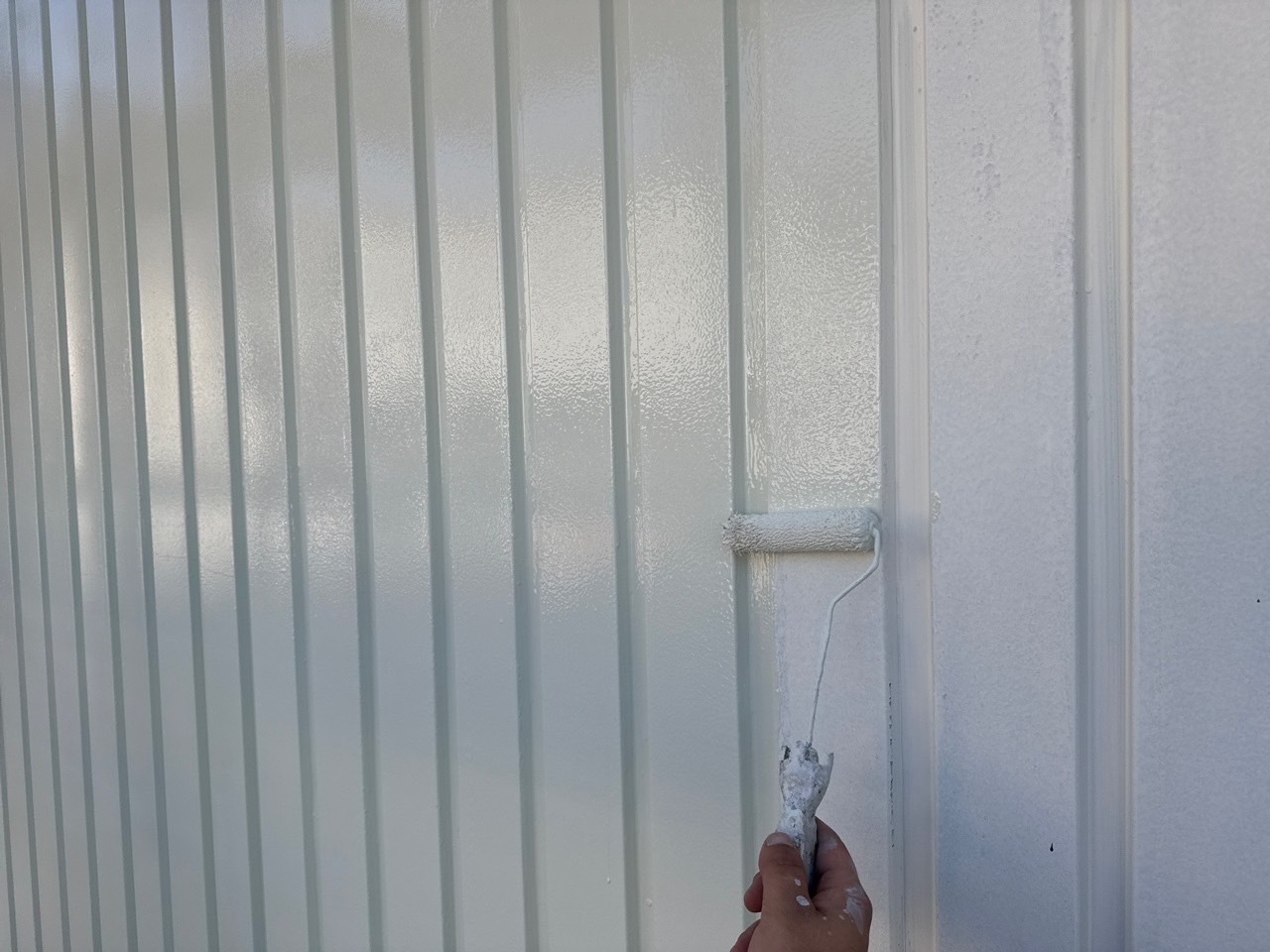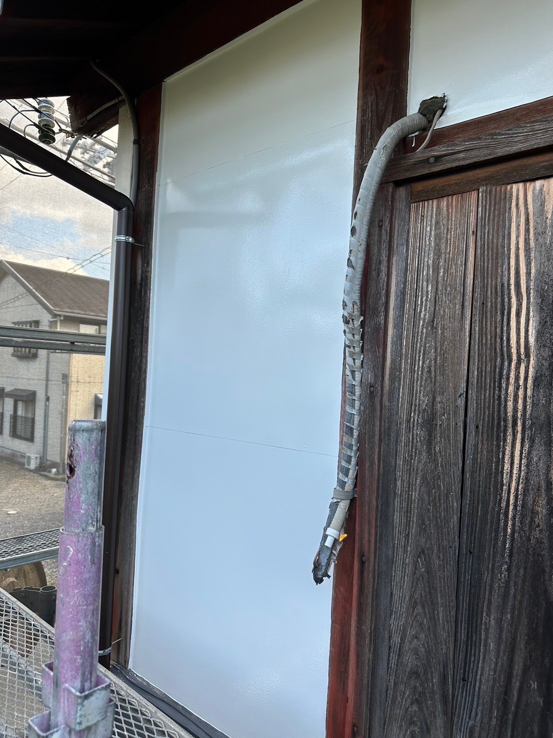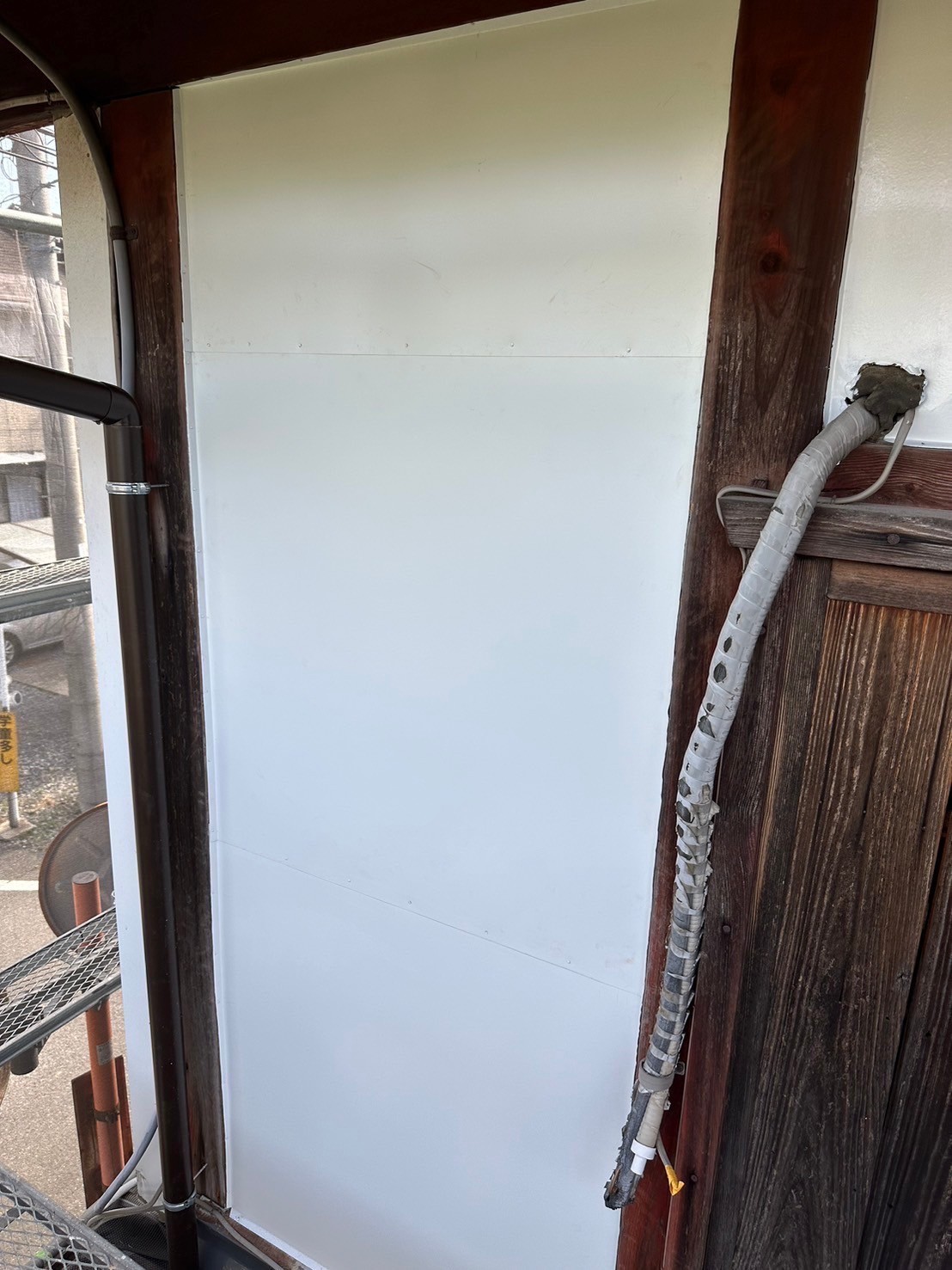 本日の作業は既存のベコベコなった板金を撤去して新しく白の平板板金を現場で加工して張ってから塗装をしました。ありがとうございました。