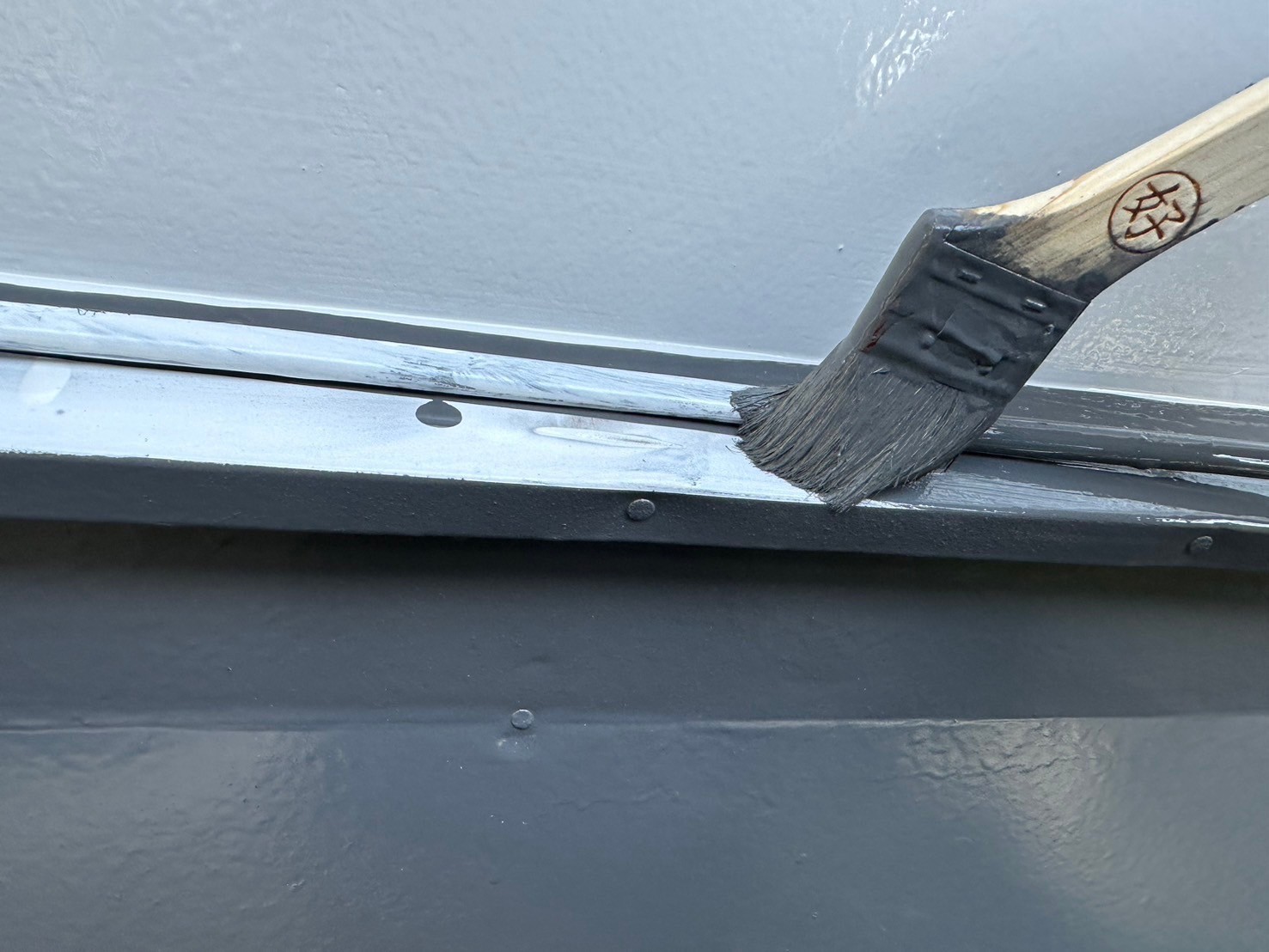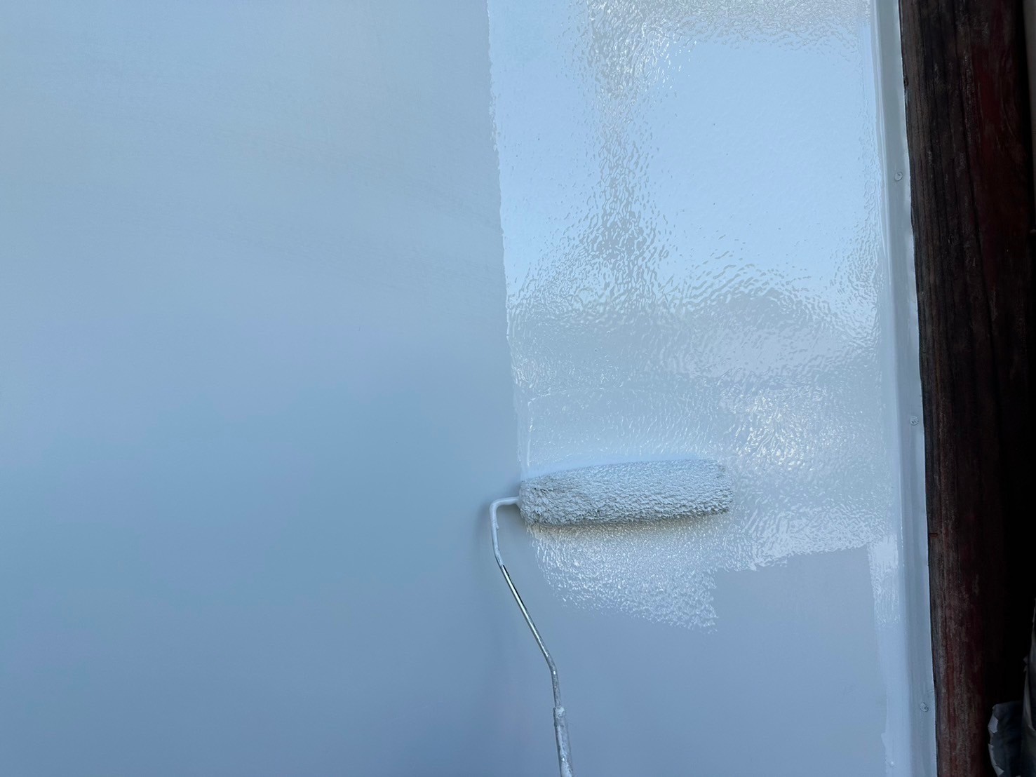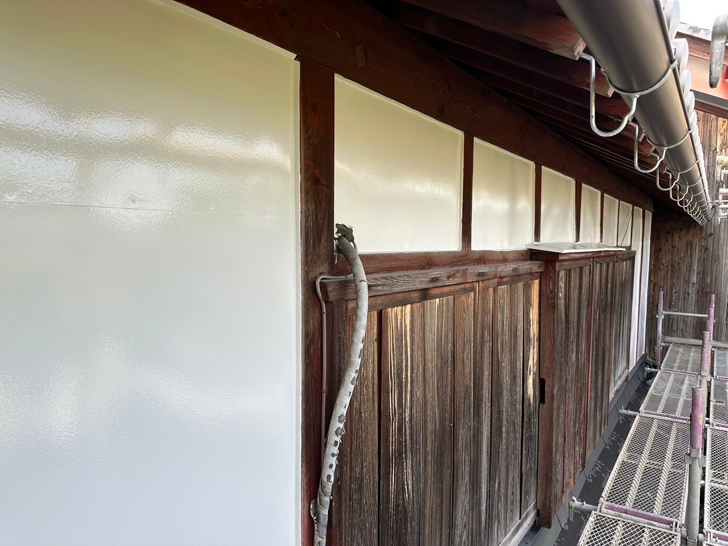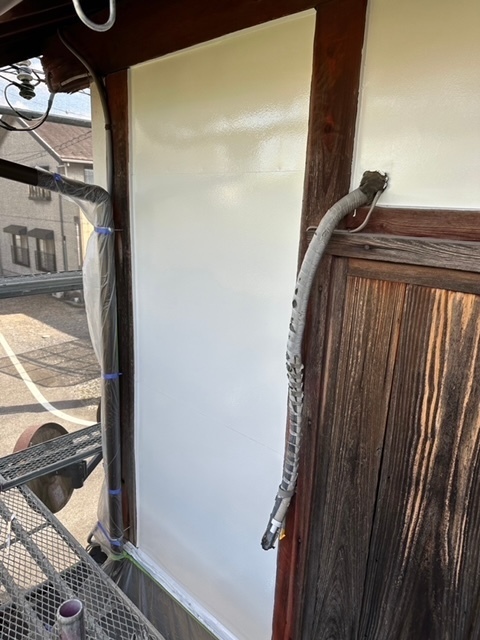本日の作業は既存のベコベコなった板金を撤去して新しく白の平板板金を現場で加工して張ってから塗装をしました。ありがとうございました。