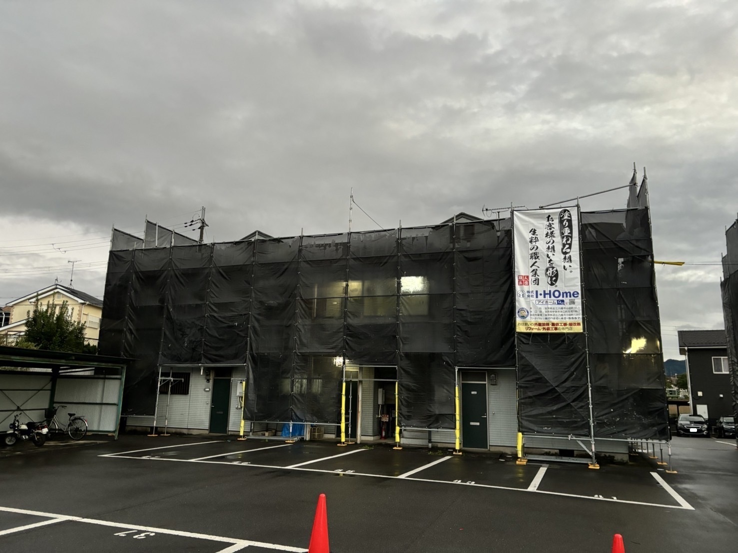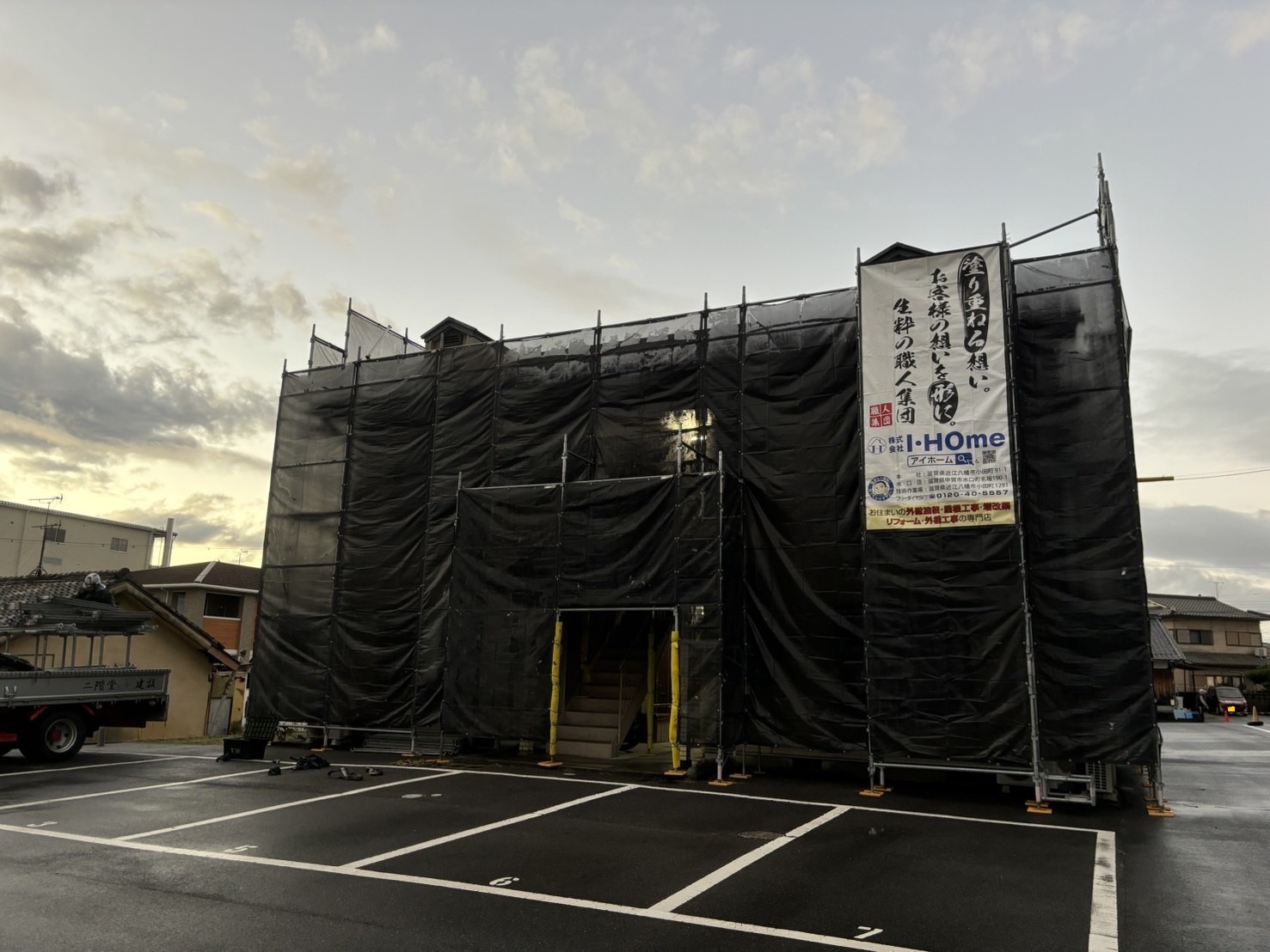 雨の中、足場架設完了しました。2棟同時でしたので2日かかりました。本日完了です。月曜日に高圧洗浄から本格的に工事スタートします。引き続き宜しくお願いします。またアップします。