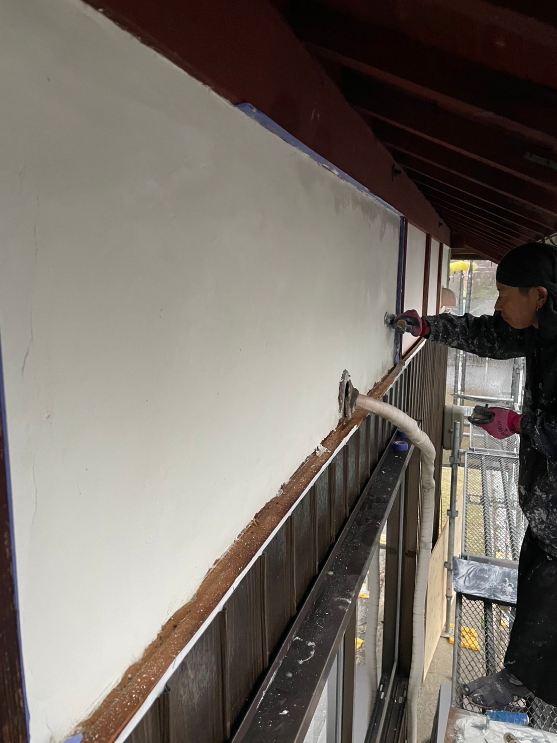 今日の作業は私と工務で雨でしたが屋根で濡れない場所なので白壁漆喰仕上げを途中まで仕上げました。明日も引き続き宜しくお願いします。またアップします。