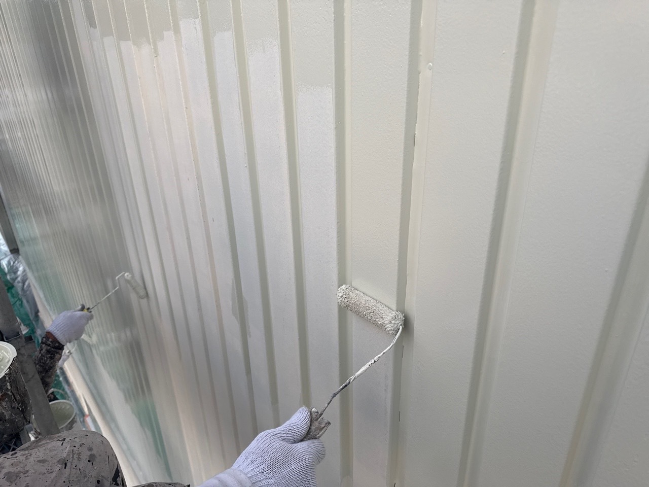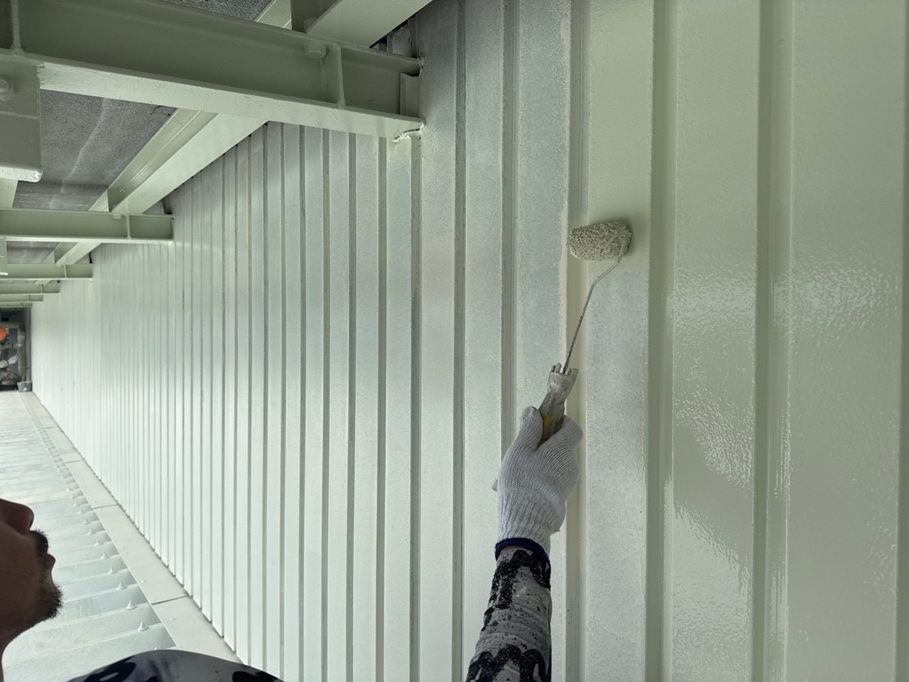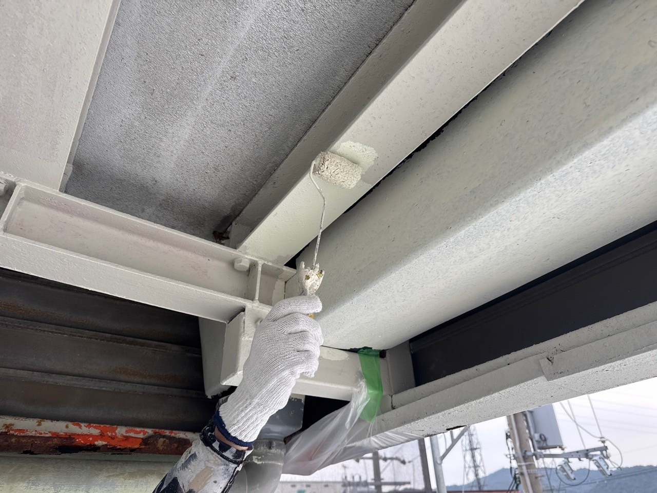 今日から錆止め終わった箇所は中塗りスタートしました。屋根はボルトキャップのサビヤーズ装着しております。引き続き宜しくお願いします。またアップします。