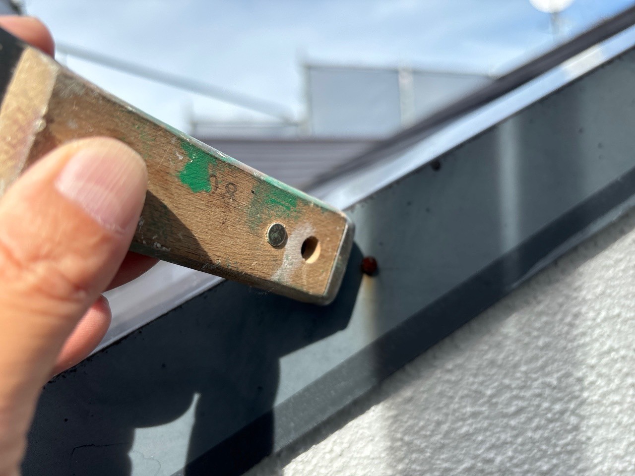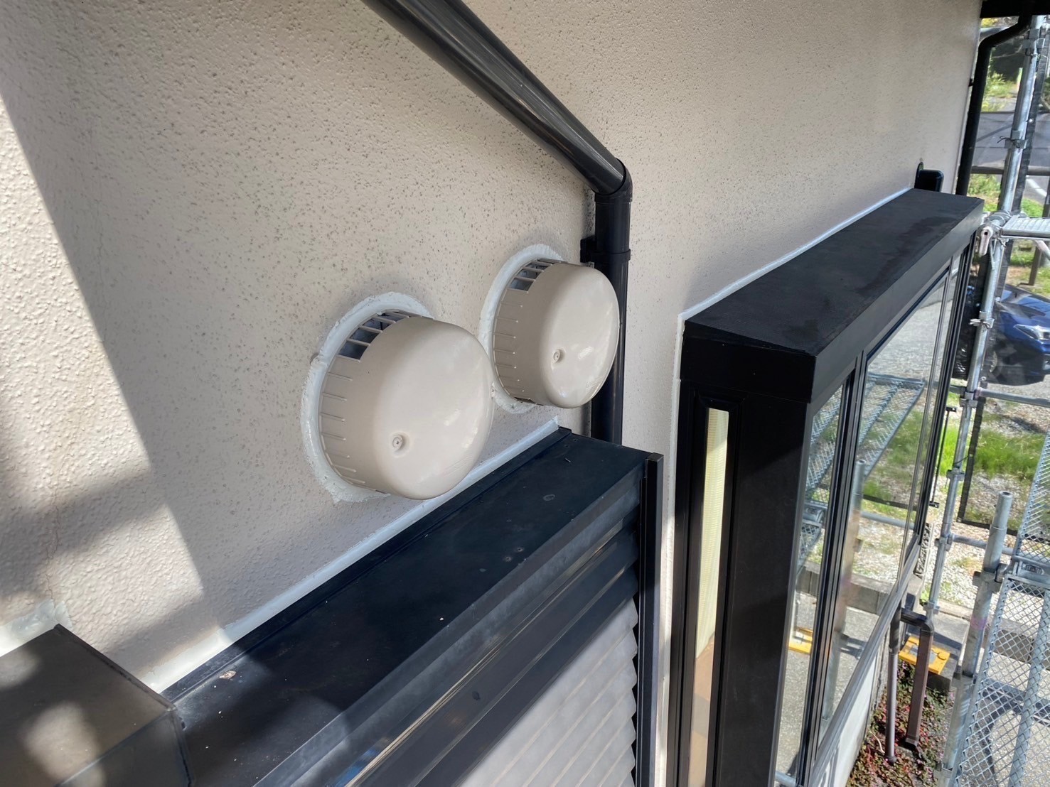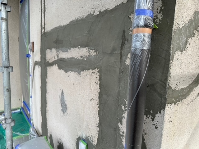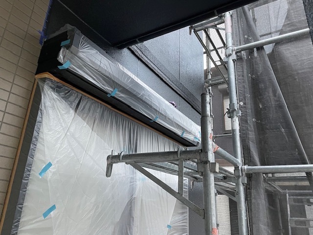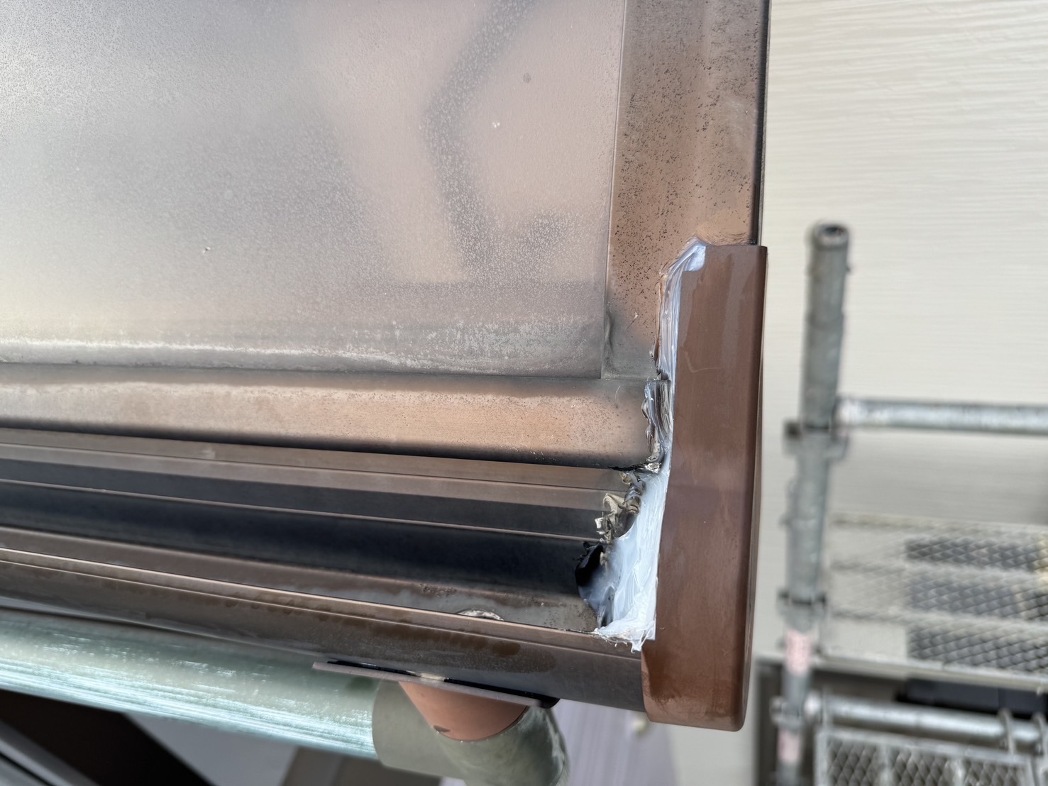 テラスの樋の端の方から水が少し漏れていたので足場があるうちにコーキング処理をしました。テラス竪樋は足場解体後に交換予定です。明日はいよいよ足場解体です。また完成写真アップします。