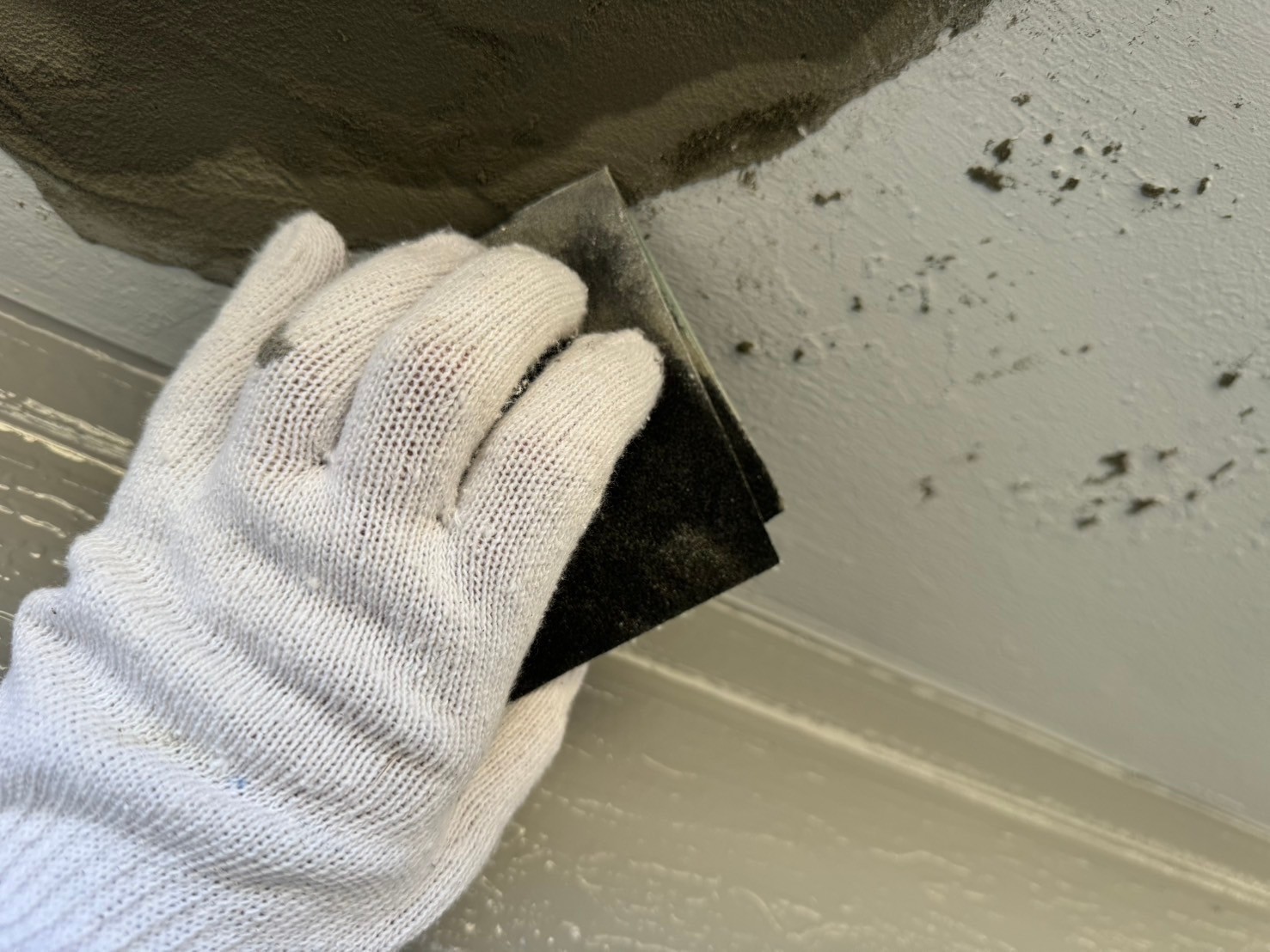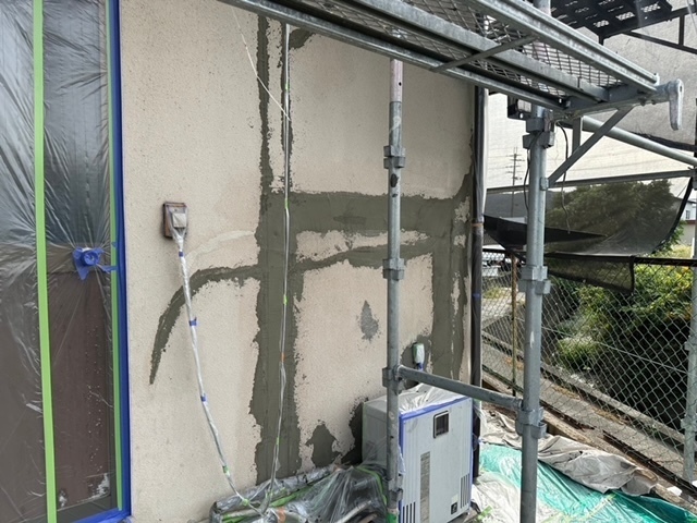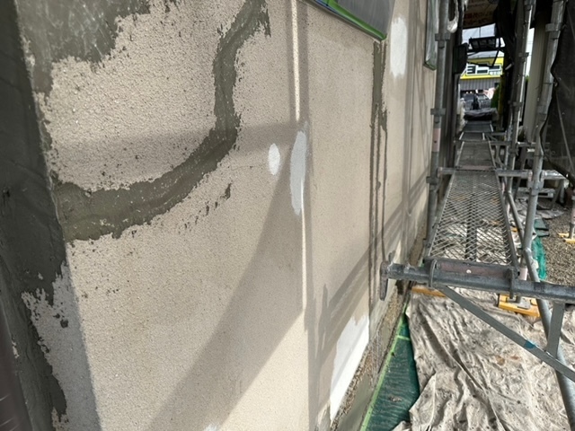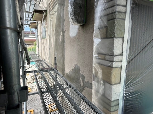 今日はリシンが捲れている箇所をカチオンでコテ補修と基礎部の樹脂が取れている箇所はライトセメントでコテ補修しました。次回はリシン用の魔法のローラーで柄をつけていく作業をします。俺の可愛い事務員ちゃん2人が今日は、外壁作業でめくれ落ちたリシンの塗膜のゴミを丁寧に掃除してくれたので助かりました。陳謝!引き続き宜しくお願いします。またアップします。