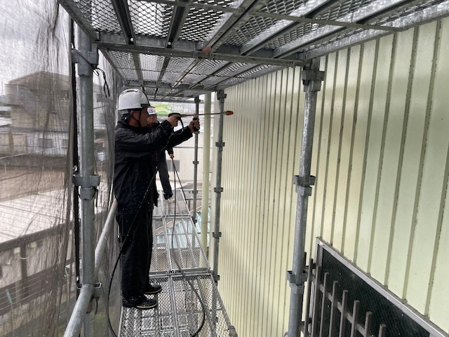 高圧洗浄2日目です。大きな建物ですが何とか2日で洗浄作業完了です。掃除などが少し残ったので月曜日に残り作業を行い塗装工程に入っていきます。引き続き宜しくお願いします。またアップします。