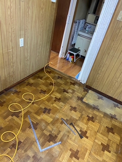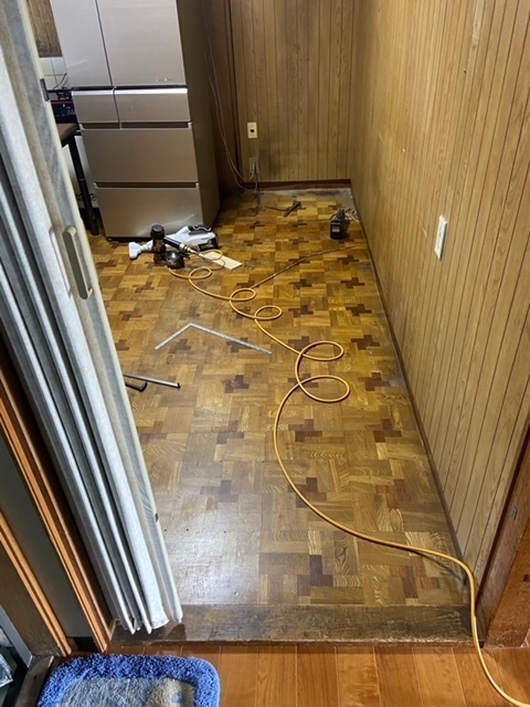 外壁塗装工事は養生作業の様子です。やっと養生作業が終わりました。内部の大工工事は今日はキッチンの床の増し張り工事と床補強、釘増し撃ち、敷居、巾木首切り作業をしました。引き続き宜しくお願いします。またアップします。