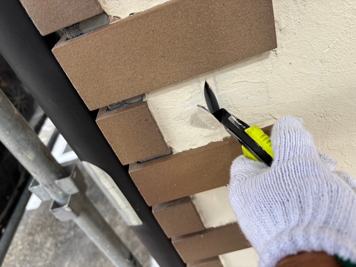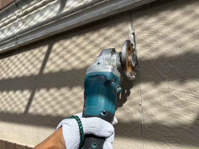 今日は外壁部のクラック(ヒビ割れが酷い部分)をUカット、サンダーで削り作業と目地(シール)打ち替えの養生作業を行いました。明日も引き続き宜しくお願い致します。またアップします。