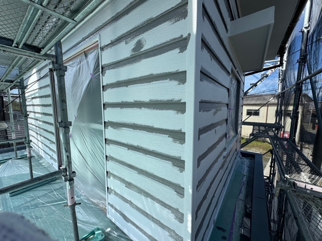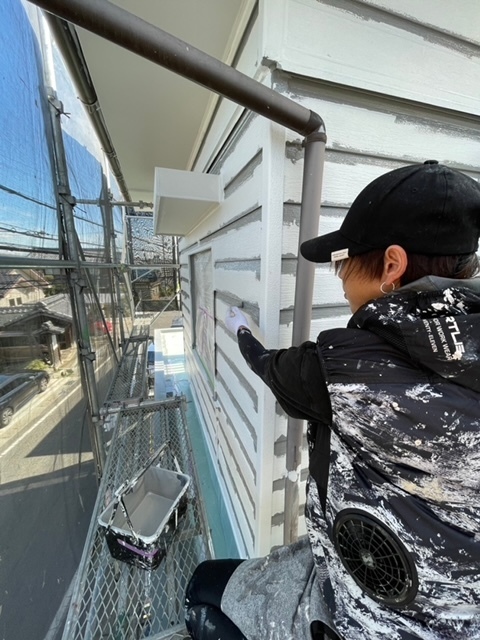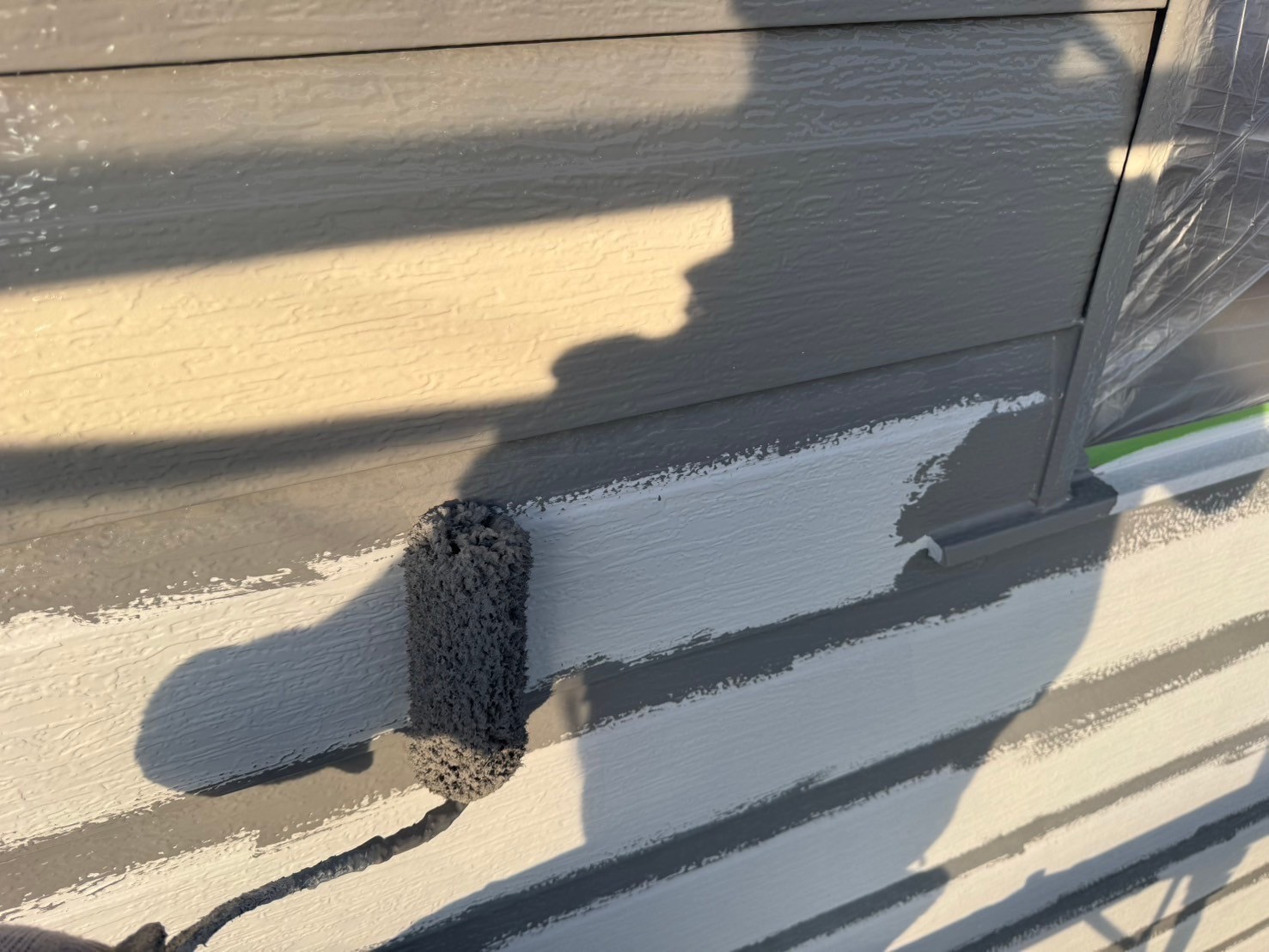 今日の作業は金属サイディングの面を2回塗装しました。先に塗料が入りにくい細い横目地に刷毛でしっかり塗装しました。引き続き宜しくお願いします。またアップします。