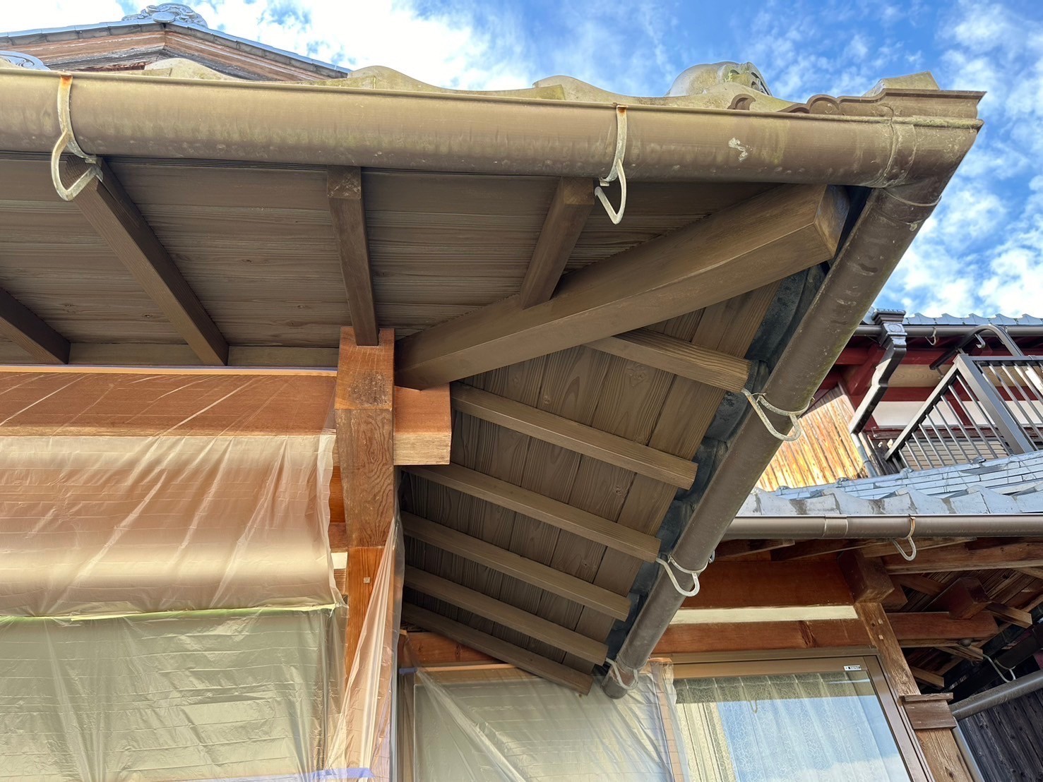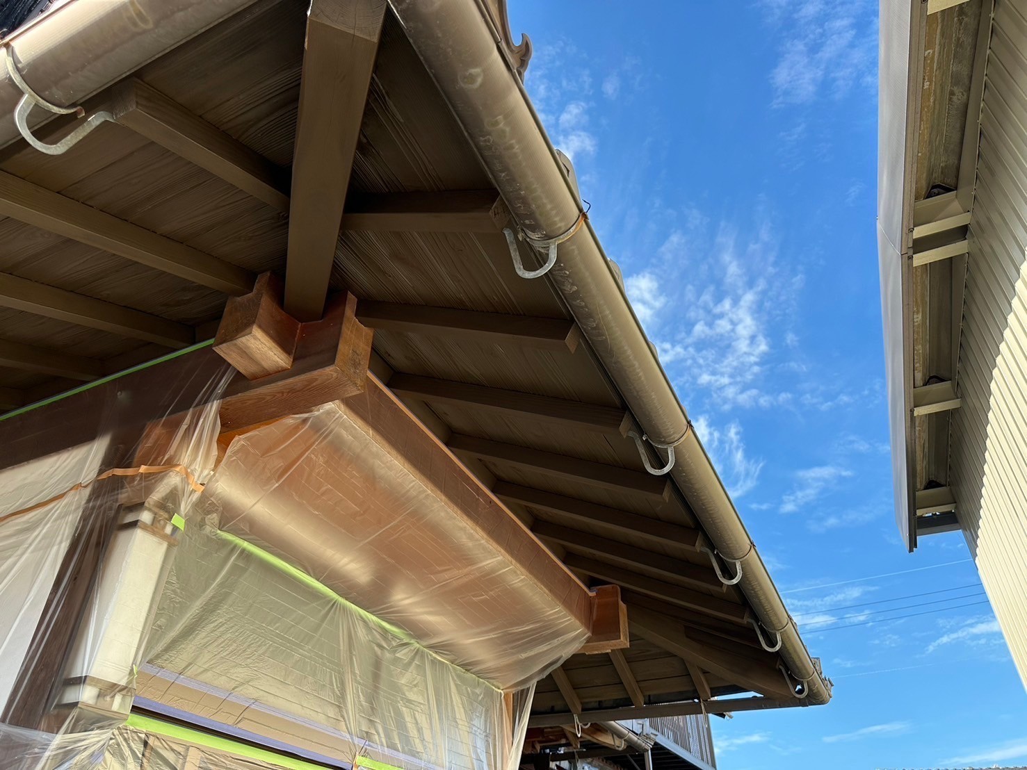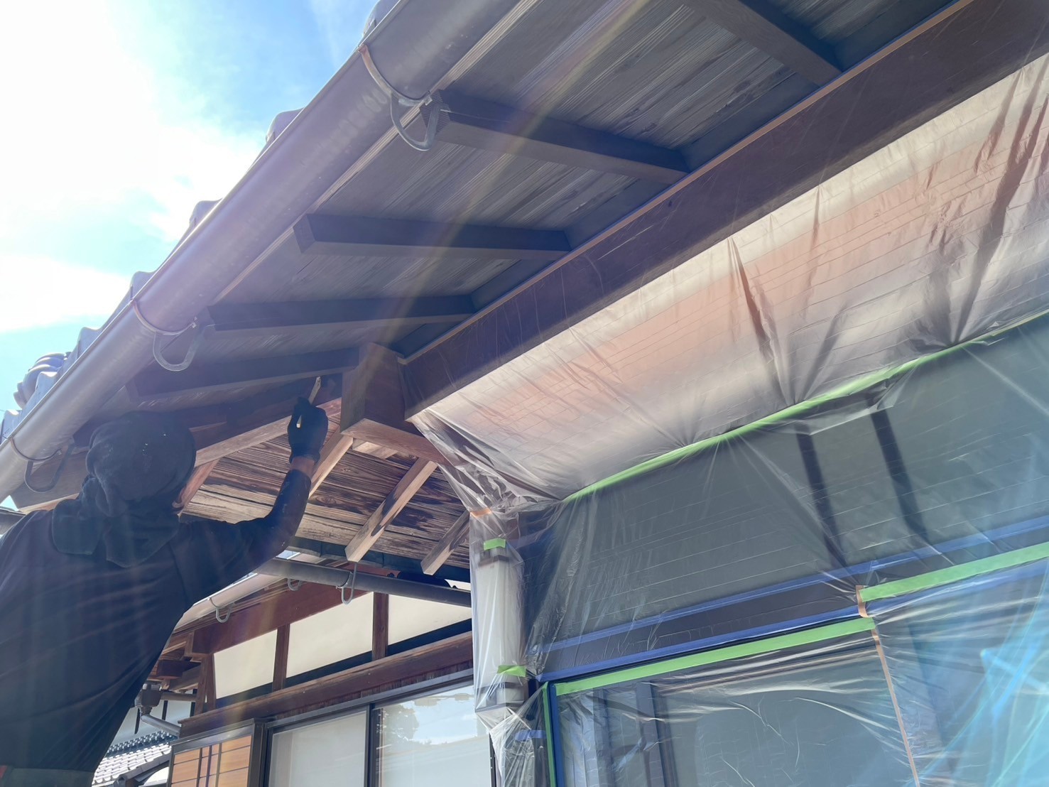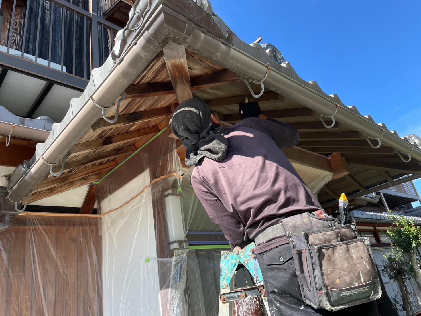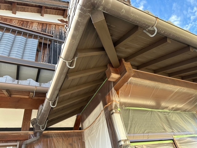 今日は入母屋の木部(垂木、軒天板、淀屋、面戸)の養生、ケレン作業から入り1回目の塗装工事をしました。引き続き宜しくお願いします。またアップします。