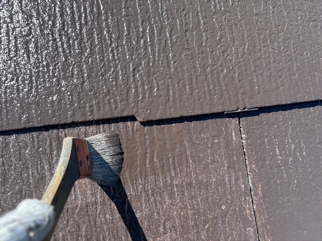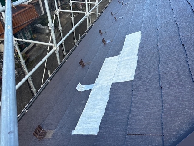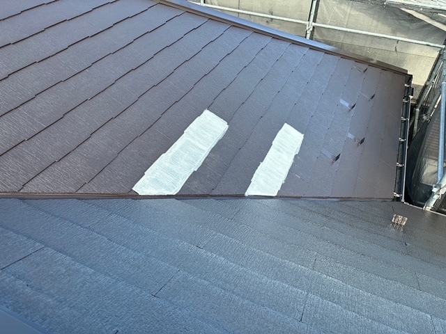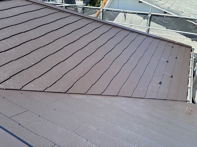 Iさま邸のカラーベスト差し替え部の塗装と最後にウレアックスHGで防水TOPコートをしました。屋根、外壁塗装関係は私石橋が点検をしっかりしました。後は19日に足場解体作業をして私がお家の周りの掃除作業を行います。ついでに玄関前の草が伸びて気になりますので刈っておきますね。Iさまあと2日です。新築みたいに見えるので楽しみにしておいてくださいね。またアップします。