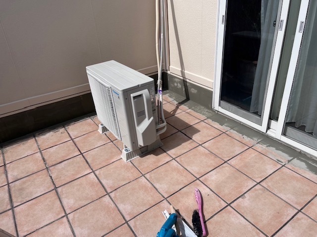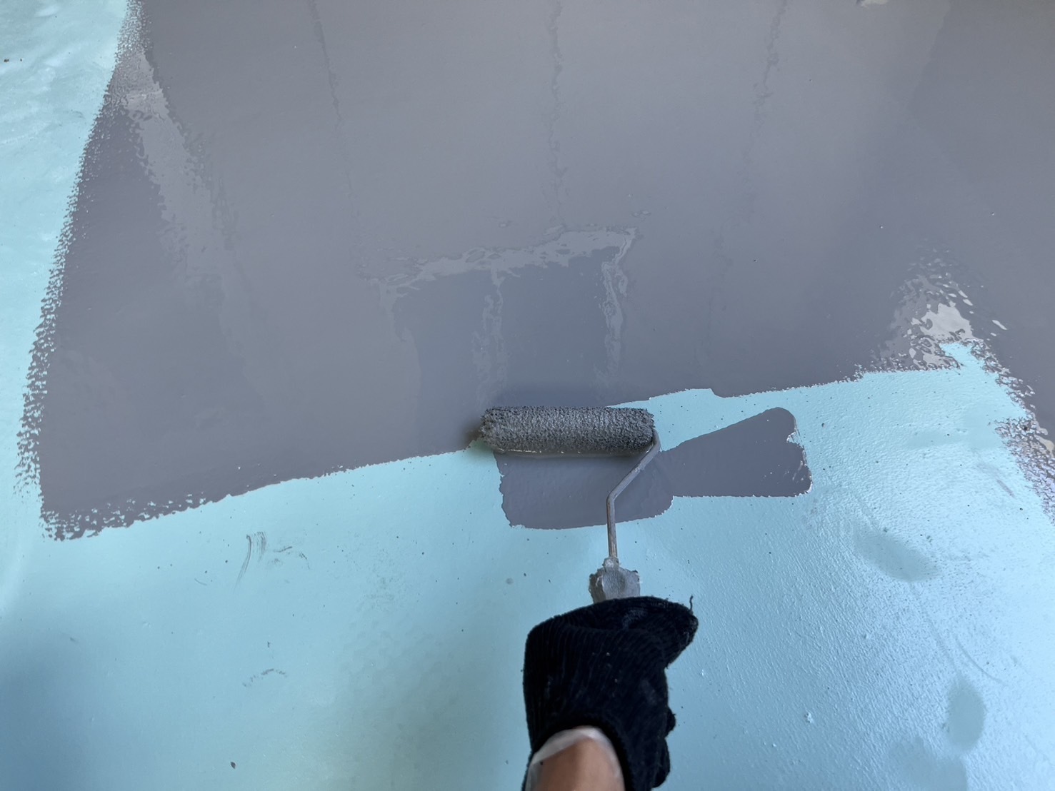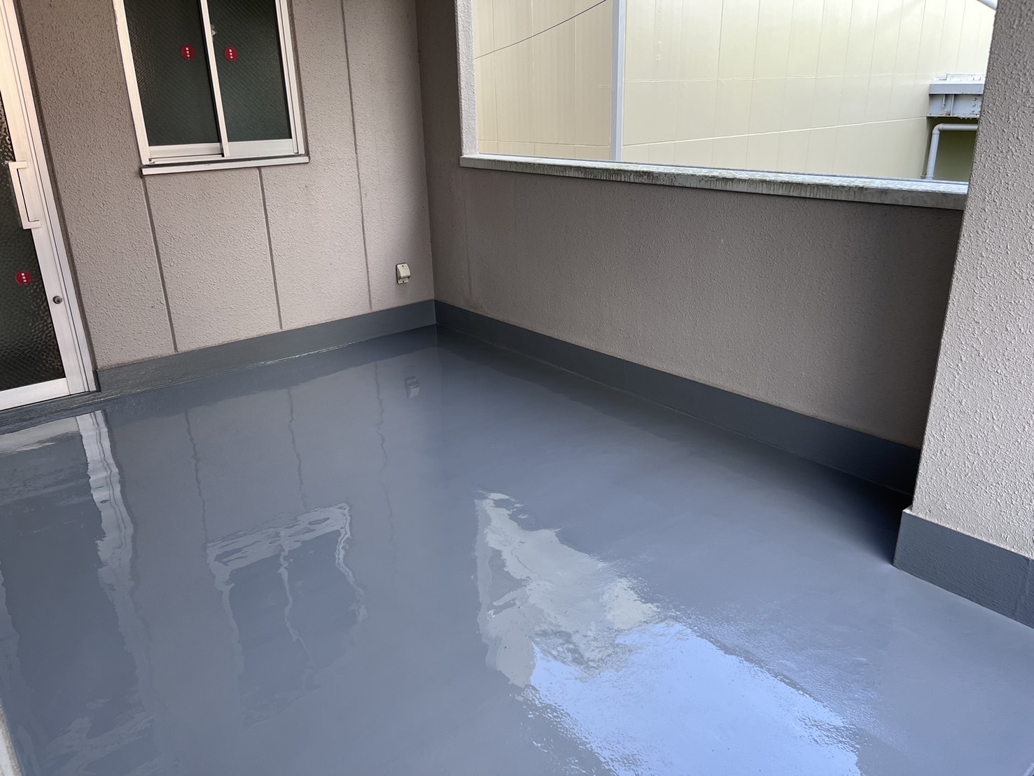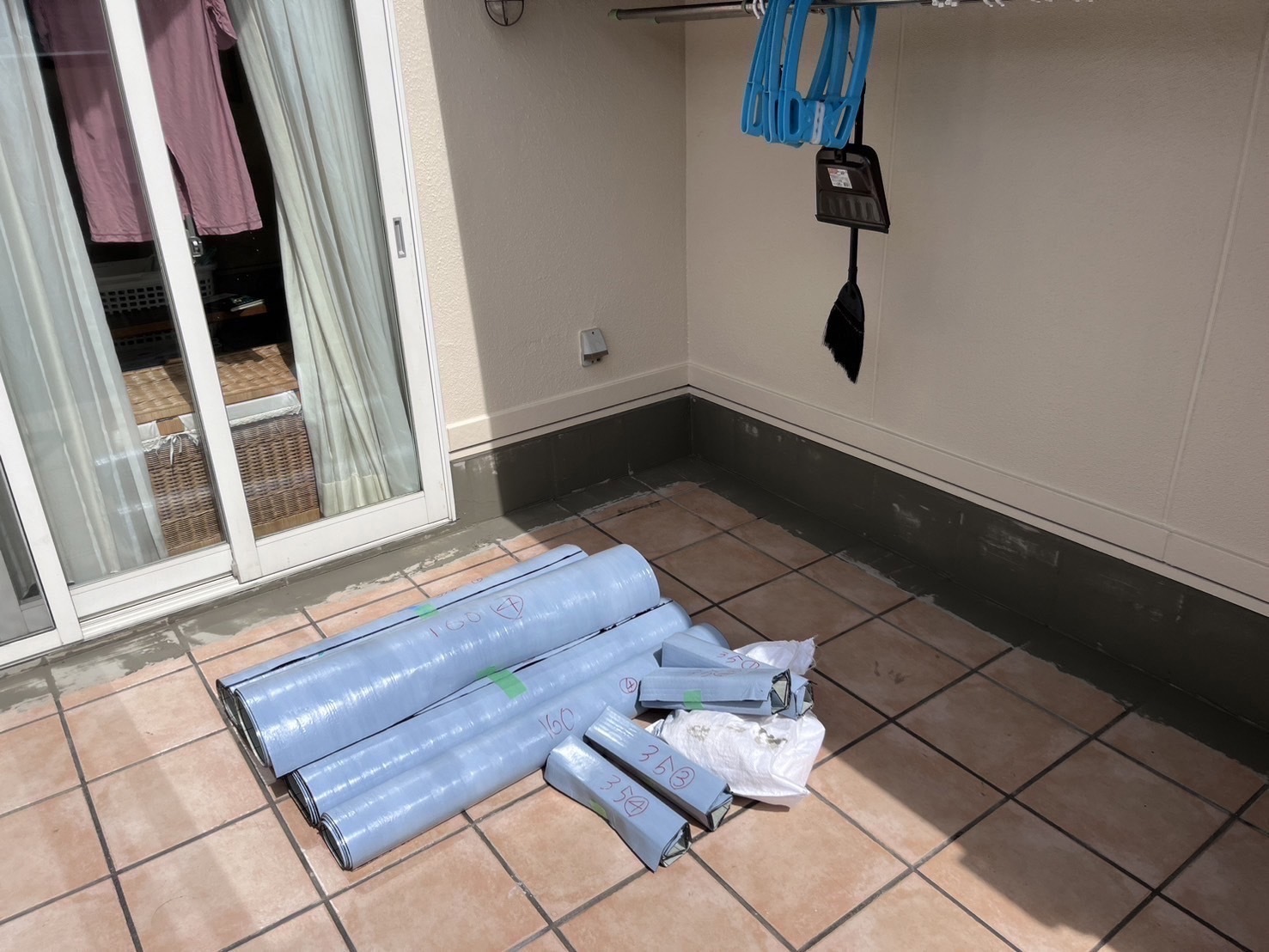 Iさま邸、今日から追加のベランダ絶縁工法をさせて頂きます。床面がタイル張りなのでタイルは防水材と相性が悪いので床部の隅周りをシールしてからプライマー塗布、シートまで作業しました。立上り部はシートだと隅が後々浮いてくる可能性があるので床部のチリ周りで縁を切り立上り部は密着ウレタン工法で仕上げをします。これで今後も安心です。Iさま引き続き宜しくお願いします。
