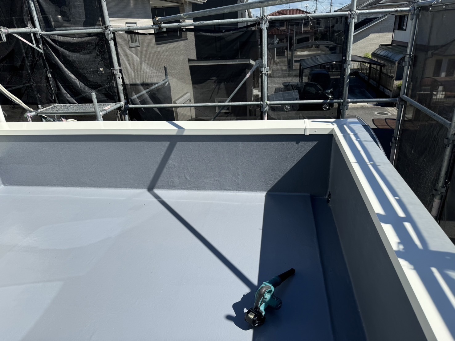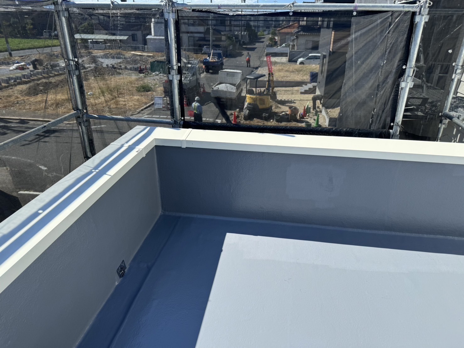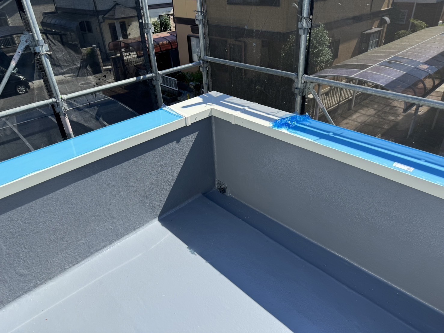 防水工事が完了した屋根に笠木を取り付けました。今回はアルミ笠木です。笠木の下もしっかり水仕舞いして施工しました。またアップします。