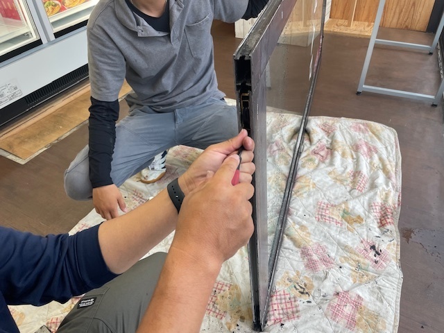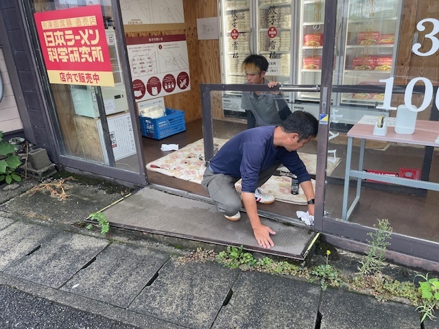 台風の影響で朝から雨が降ってましたね。月曜日の朝方くらいまでは降ったり止んだりの天気になりそうですね。今日は朝から店舗の中で扉の修繕工事をさせて頂きましたのでその様子をアップします。