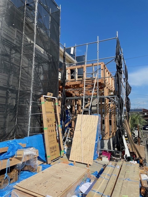 Kさま邸、上棟の様子です。昨日から土台据えを行い本日骨組み建てて明日には上棟完成予定です。雨が降ると作業できないので次の作業は屋上のFRP防水を先に行います。またアップします。