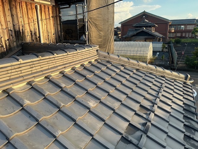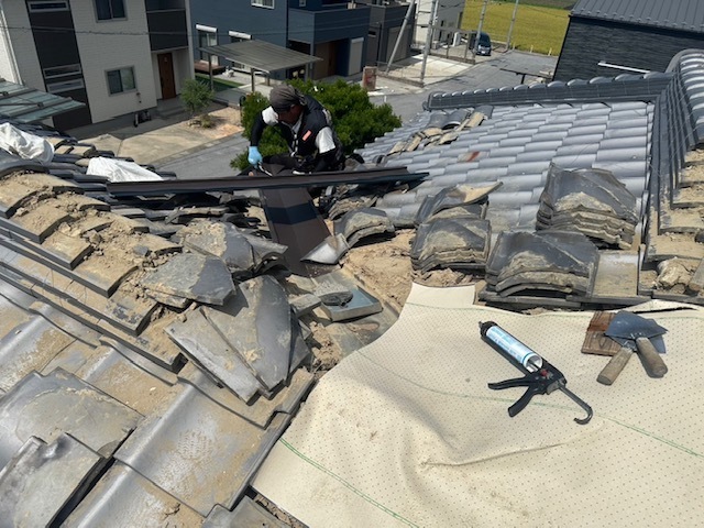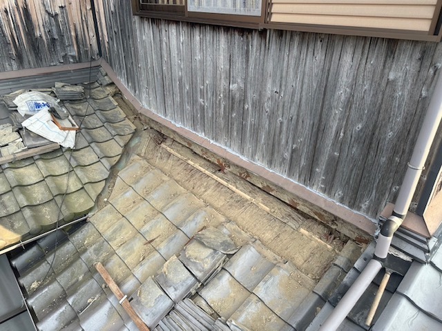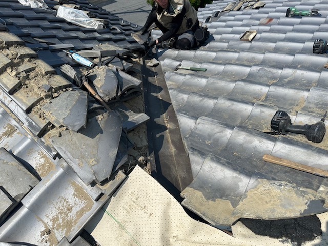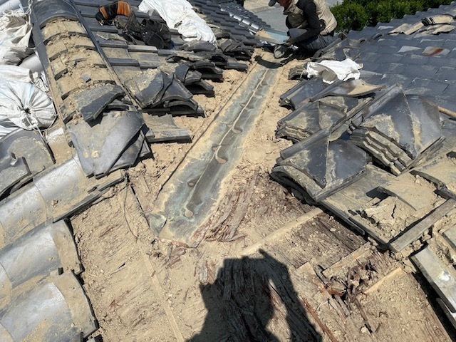 今日は大屋根棟バラシと谷板金、下屋根壁のしバラシ、漆喰作業を行いました。明日も引き続き棟積み、漆喰など進めていきます。またアップします。