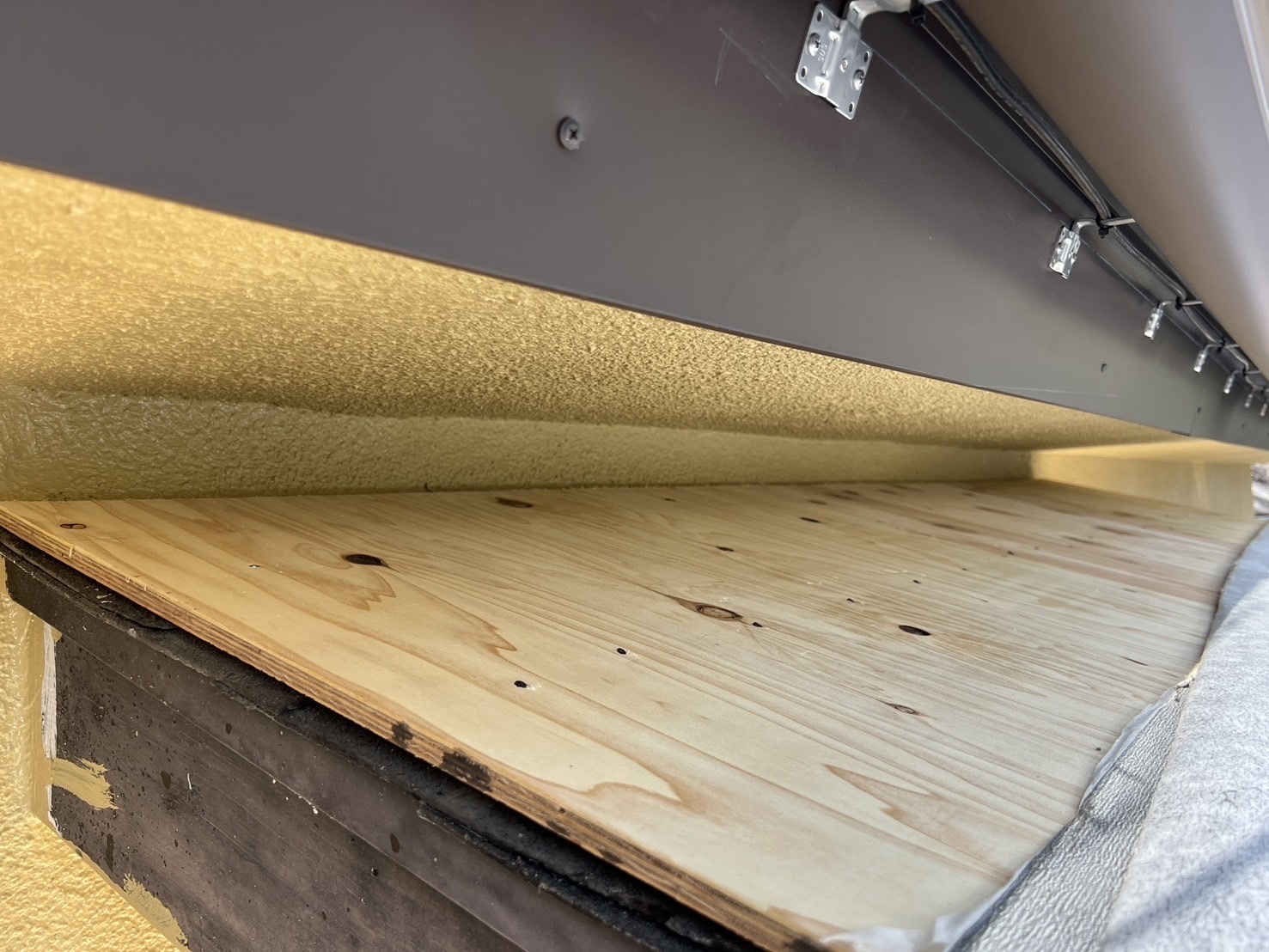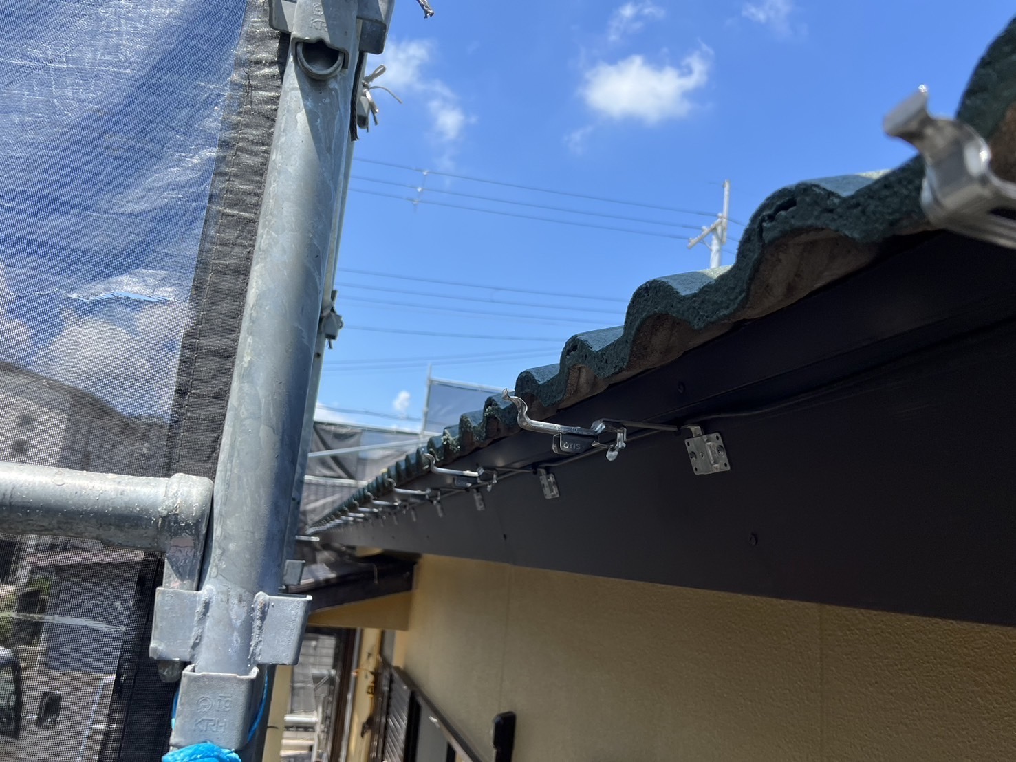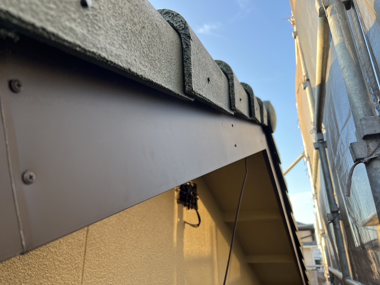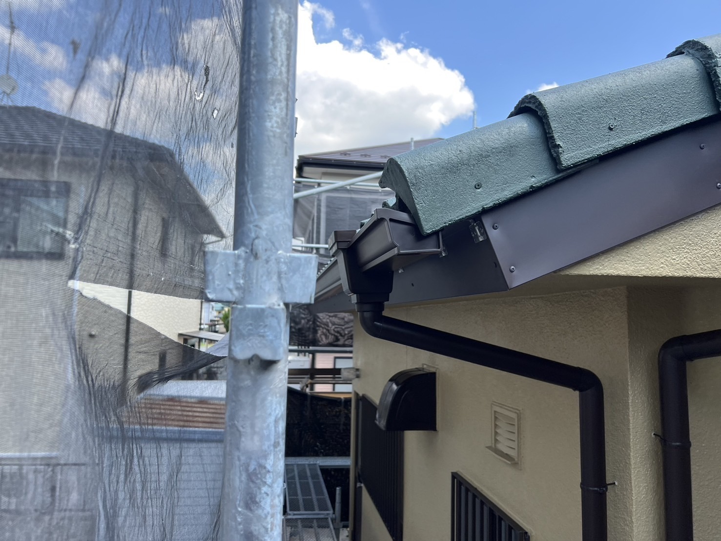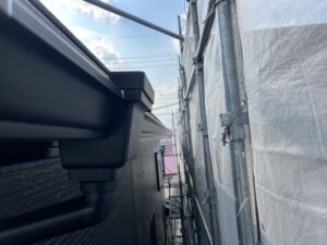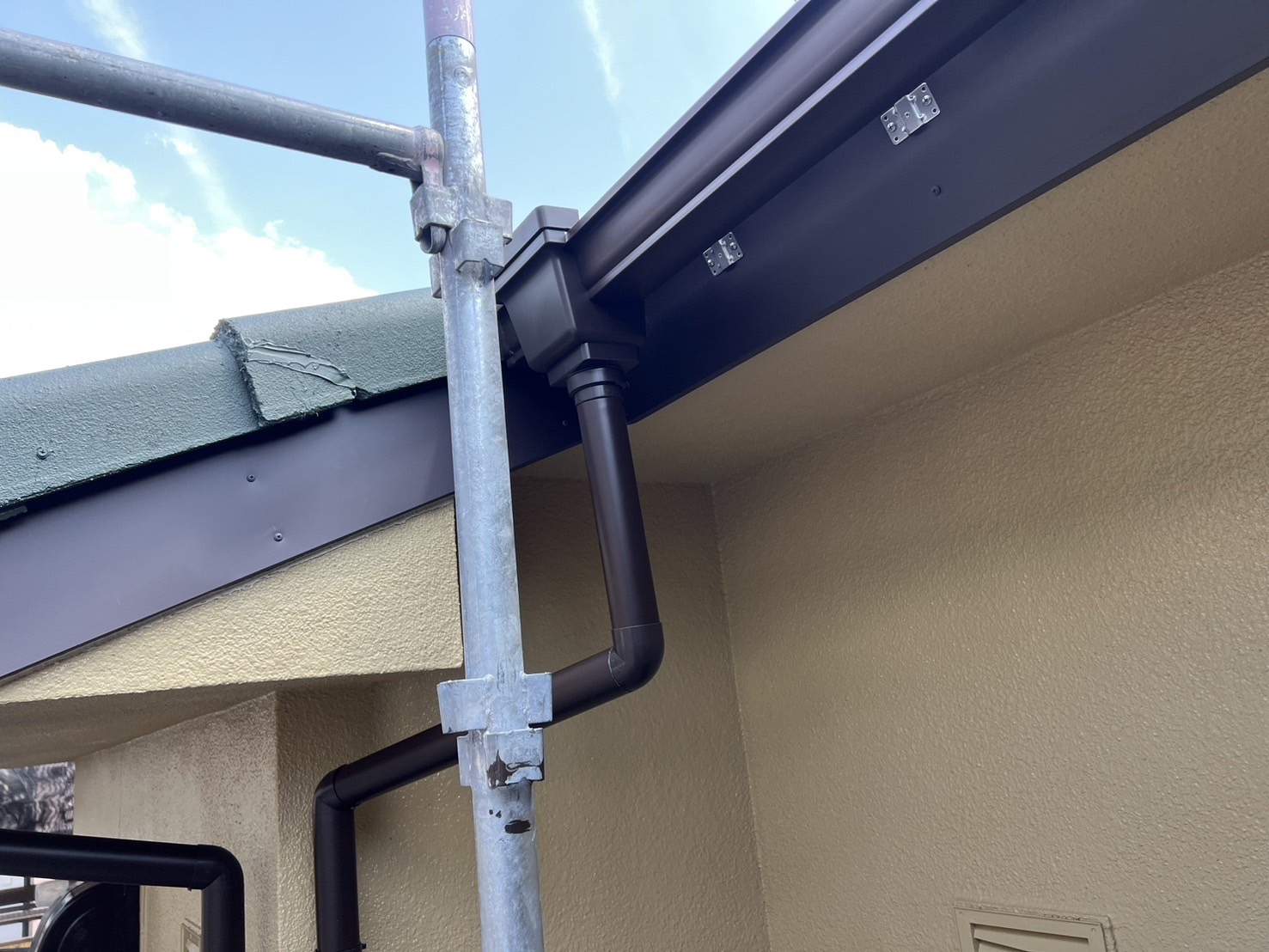 破風・鼻隠しに板金施工行いました。その後に雨樋の新設させて頂きました。お盆休みの間に足場も解体したのでまた完成写真もアップします。