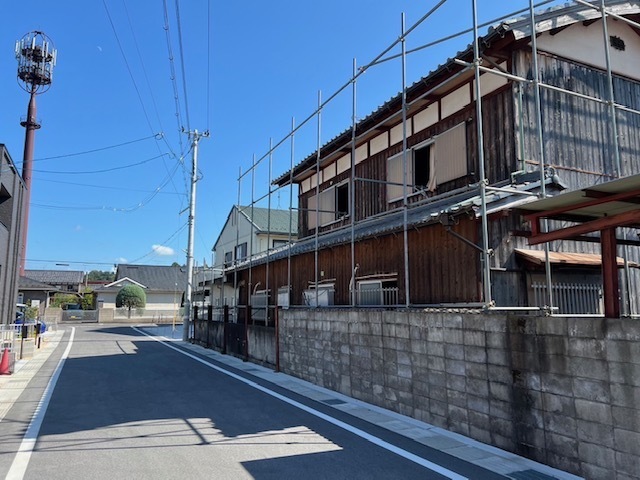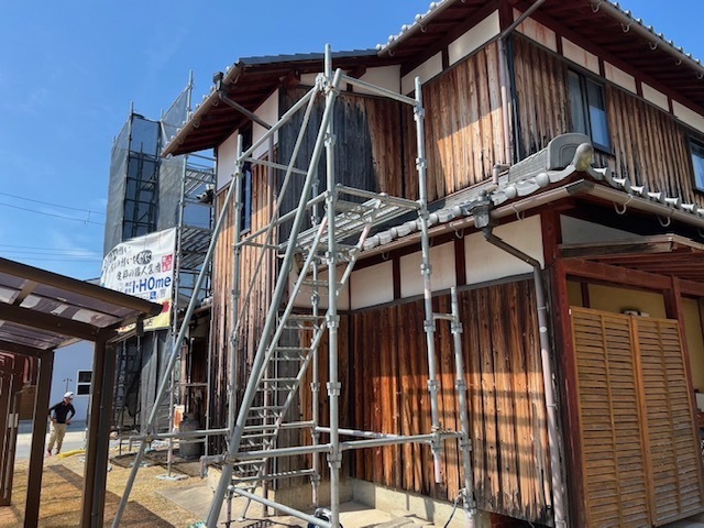 屋根工事用の足場架設完了です。右と左で2基、架設しました。谷板金やの交換、漆喰、棟の積み替え、ノシの積み替えなど実施予定です。またアップします。