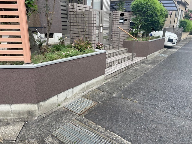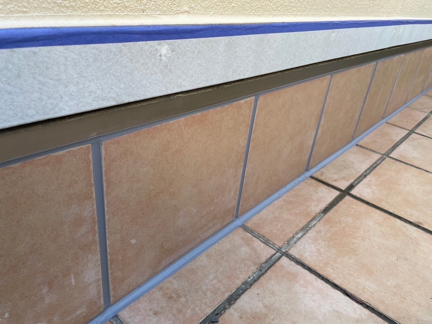 塀の塗装が白く膨れて捲れるので今回は天端に防水処理をさせて頂きました。本来ですと笠木を付けるのが良いのですが形状的に設置が厳しく今回はグレーの防水材で天端を塗装し水の浸入を防ぐように処理しました。膨れていた外壁もめくってシーラー塗って上塗り掛けました。Yさま大変お世話になり、ありがとうございました。