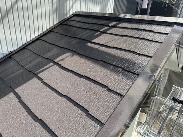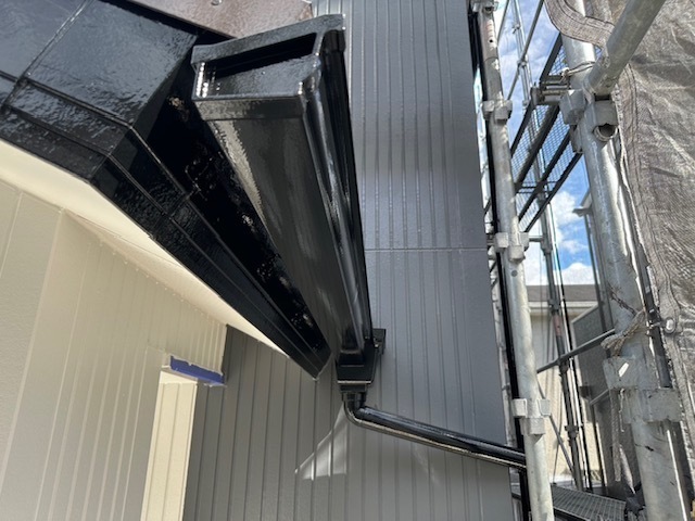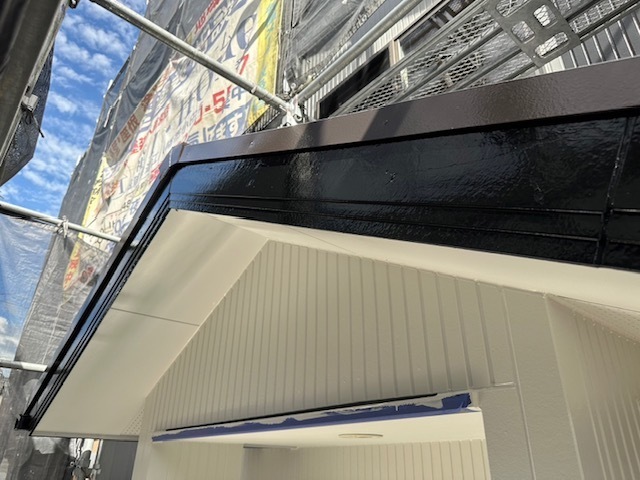 下屋根の塗装、破風鼻隠しの塗装、雨樋の塗装完了しました。順調に進んでおります。仕上がりも写真で見ても良く分かりますが本当に綺麗です。またアップします。