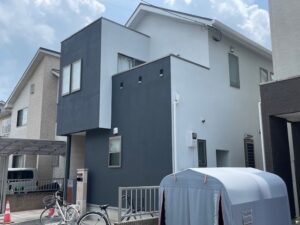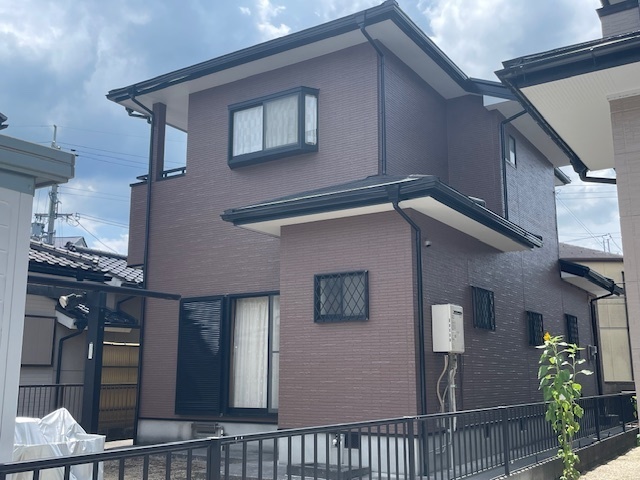 Sさま邸の完成写真です。グレーで綺麗に仕上がっております。雨樋も新品に交換させて頂いております。本日テラスも復旧し塗装工程は完了です。次は家の前のアスファルトを捲り下から生えている竹の根を抜根し土間を打つ作業です。またアップします。