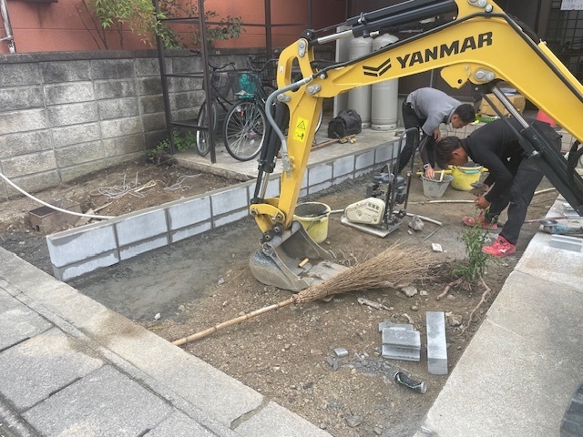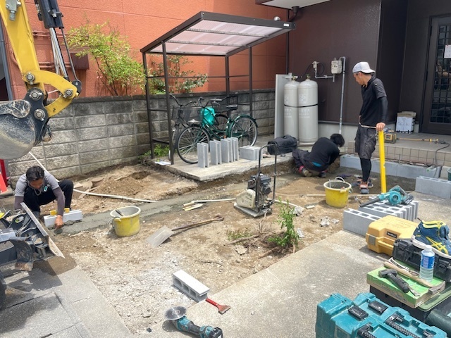 朝から波板工事の残りを行い波板工事は完了です。同じく朝から外構工事もスタートしました。朝一から施主様と打ち合わせを行いブロック積みと掘削からスタートです。最後の写真の左側の土の部分が自転車置き場までのスロープになり右側の土の部分がガレージの土間になります。月曜日に生コン予約できれば月曜日に土間打設予定です。またアップします。