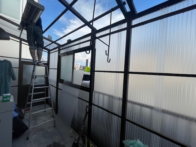波板の屋根と壁の張り替え工事を行いました。お隣様との隙間が狭くお隣様のフェンスを外させて頂き施工進めて行きました。手が入りにくい箇所でしたが職人さん暑い中、頑張って進めてくれました。また完成写真アップします。明日からは外構工事スタートです。またアップします。