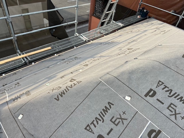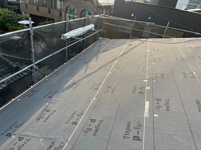 屋根のルーフィング完了しました。カバー工法も順調です。外壁も養生終わり下塗りに入っております。またアップします。