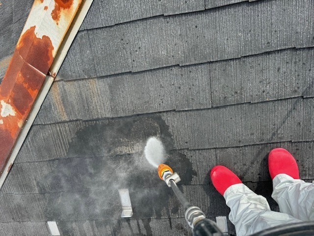 高圧洗浄の様子です。棟板金の錆も酷いのでしっかり錆止め塗布して塗装進める予定です。明日はコーキングや板金工事の予定ですが雨でダメっぽいので1日スライドしそうです。またアップします。