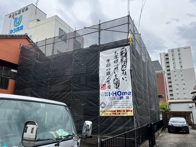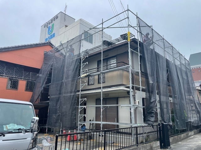Kさま邸の足場架設完了しました。雨が降る前に終わりました^^月曜日からベランダの床下地など行いますので雨が降る前に古いコケなどの除去作業と掃除を行いました。またアップします。