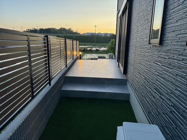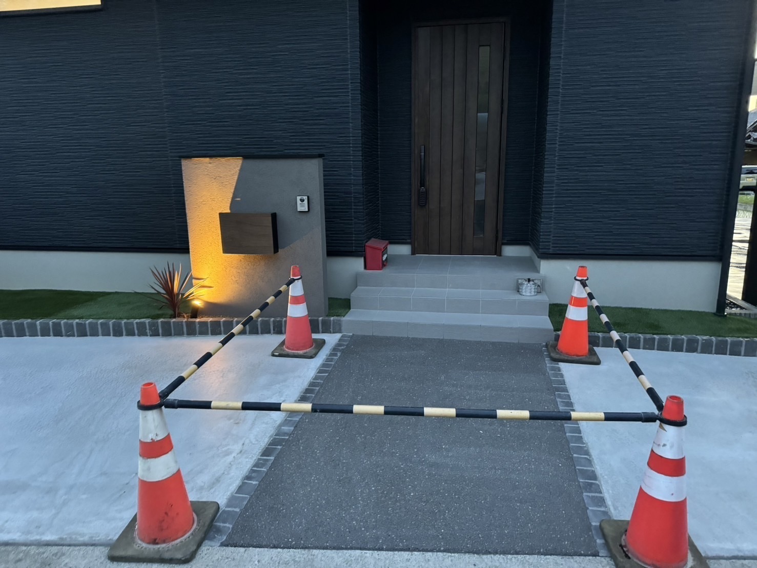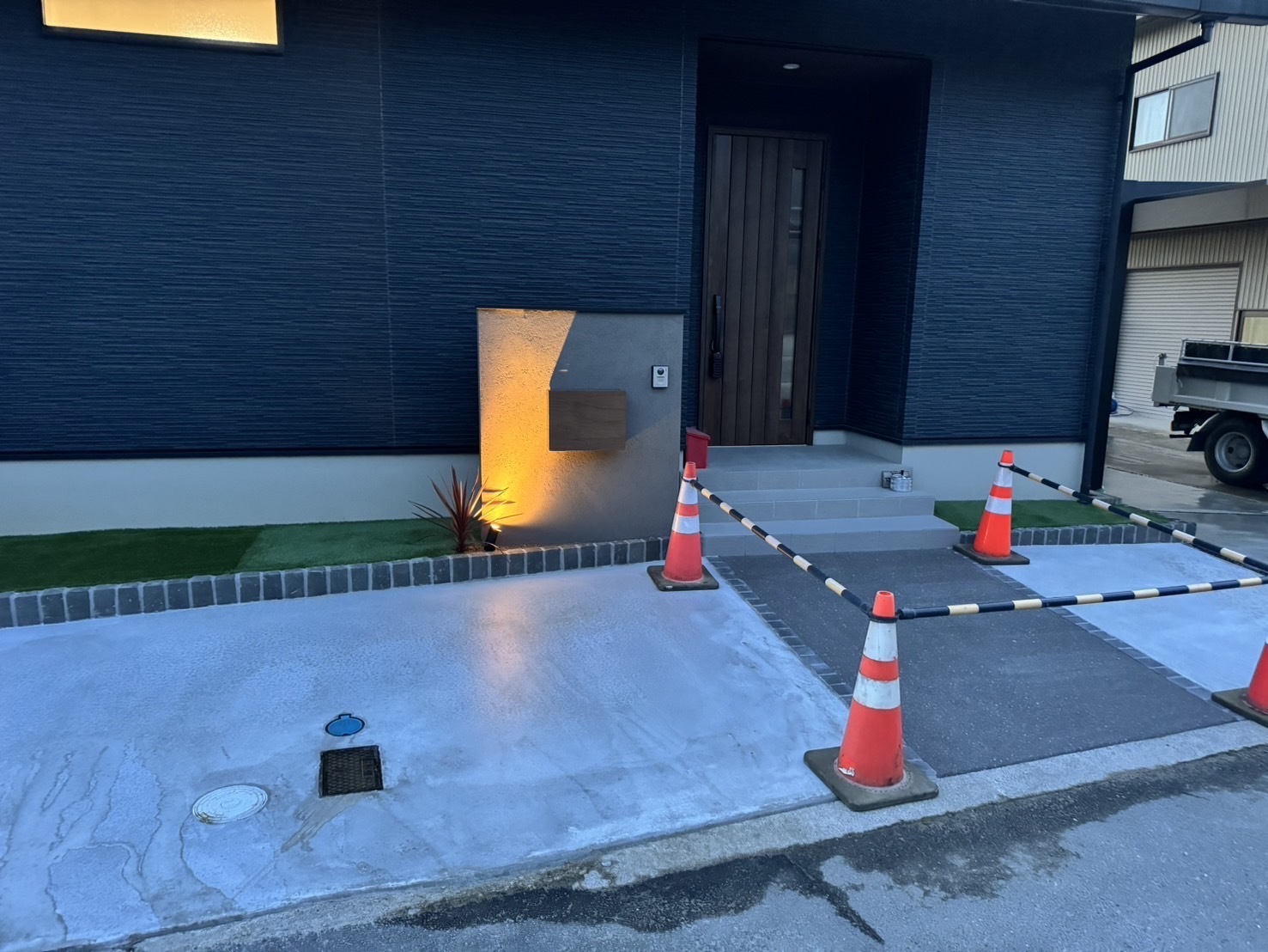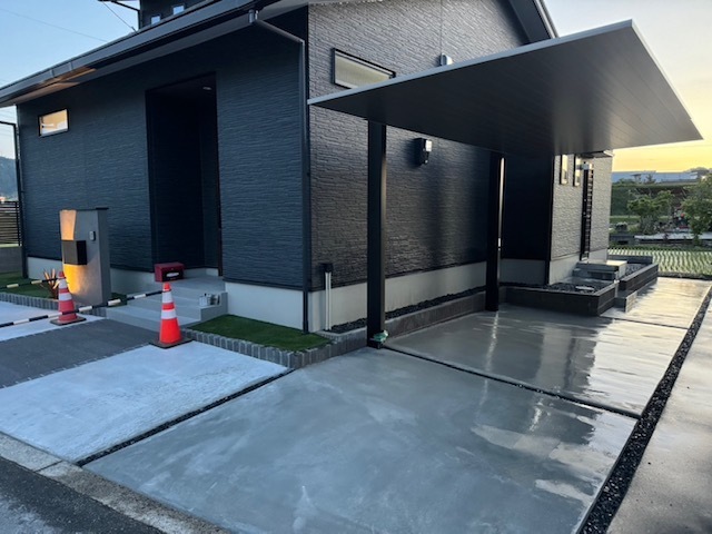 外構工事の様子。ほぼ完了です。カーポートの雨樋の工事とフェンスのカットと表札で完了になります。スタイリッシュな仕上がりでお家ともマッチしてます。また完成しましたらアップします。
