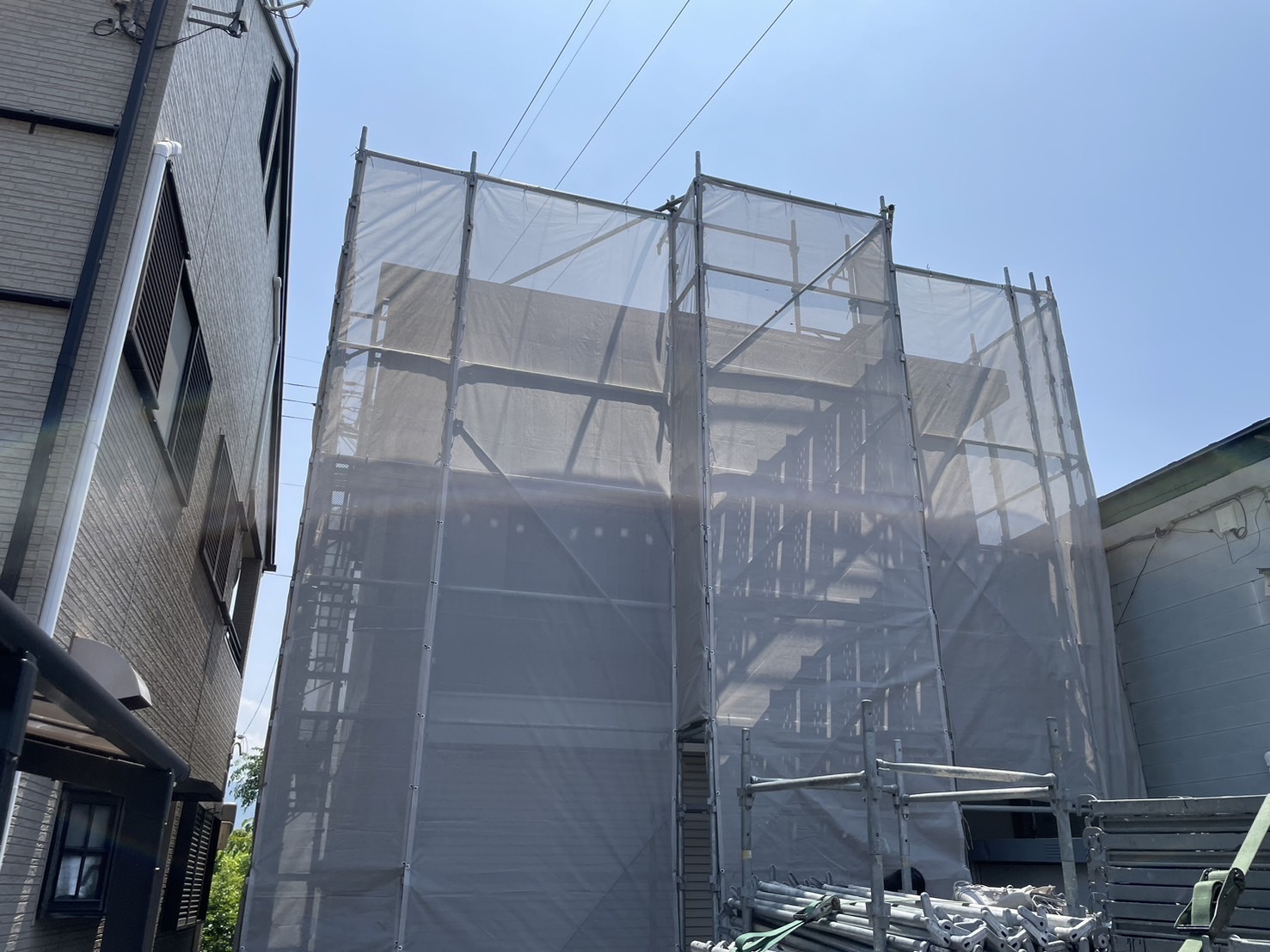 足場架設完了です。外壁を金属サイディングでカバーしていく工事です。屋根は塗装させて頂きます。いよいよ明日から本格的にスタートします。またアップします。