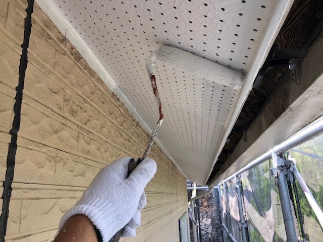 軒裏の塗装の様子です。天気も良く順調に進んでおります。雨樋内部のゴミも溜まっているので掃除も行う予定です。またアップします。