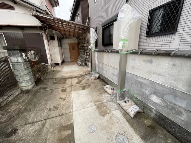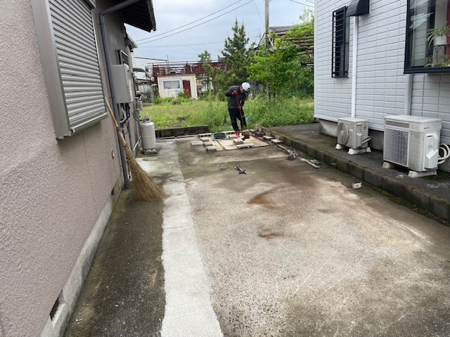 カーポートの施工の様子です。雨水の配管が思わぬところから出てきて、配管を迂回させるのに悪戦苦闘しました。なんとか上手く柱も建てることができました。続きは明日行います。